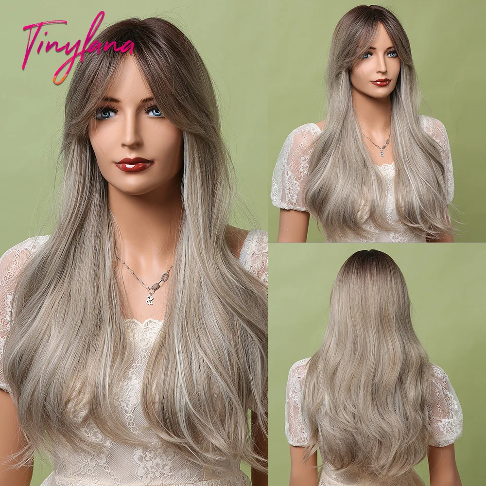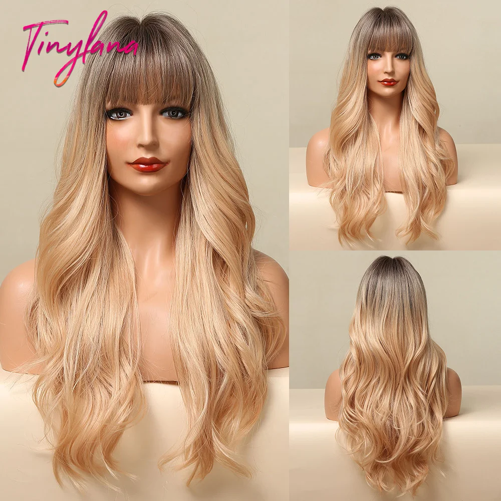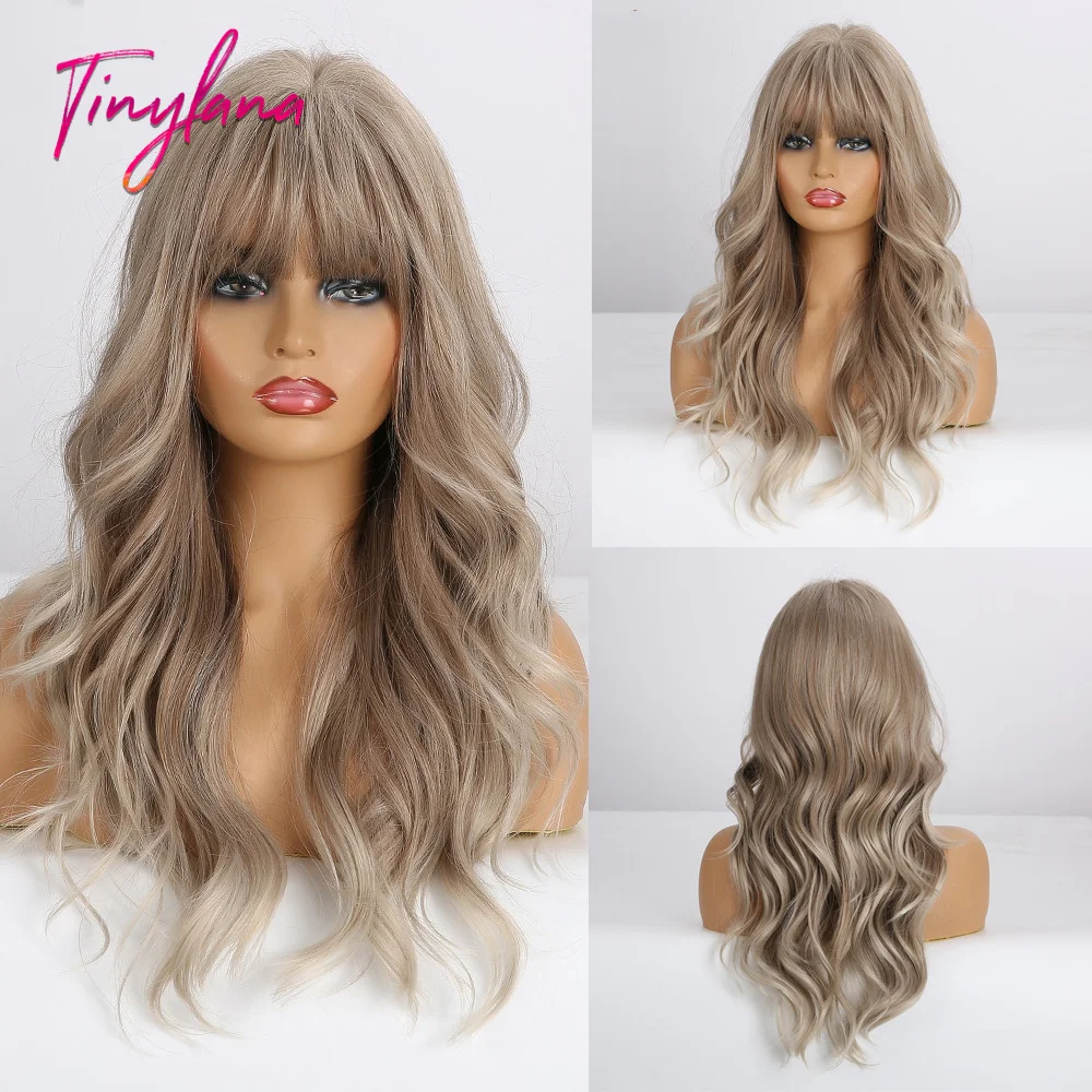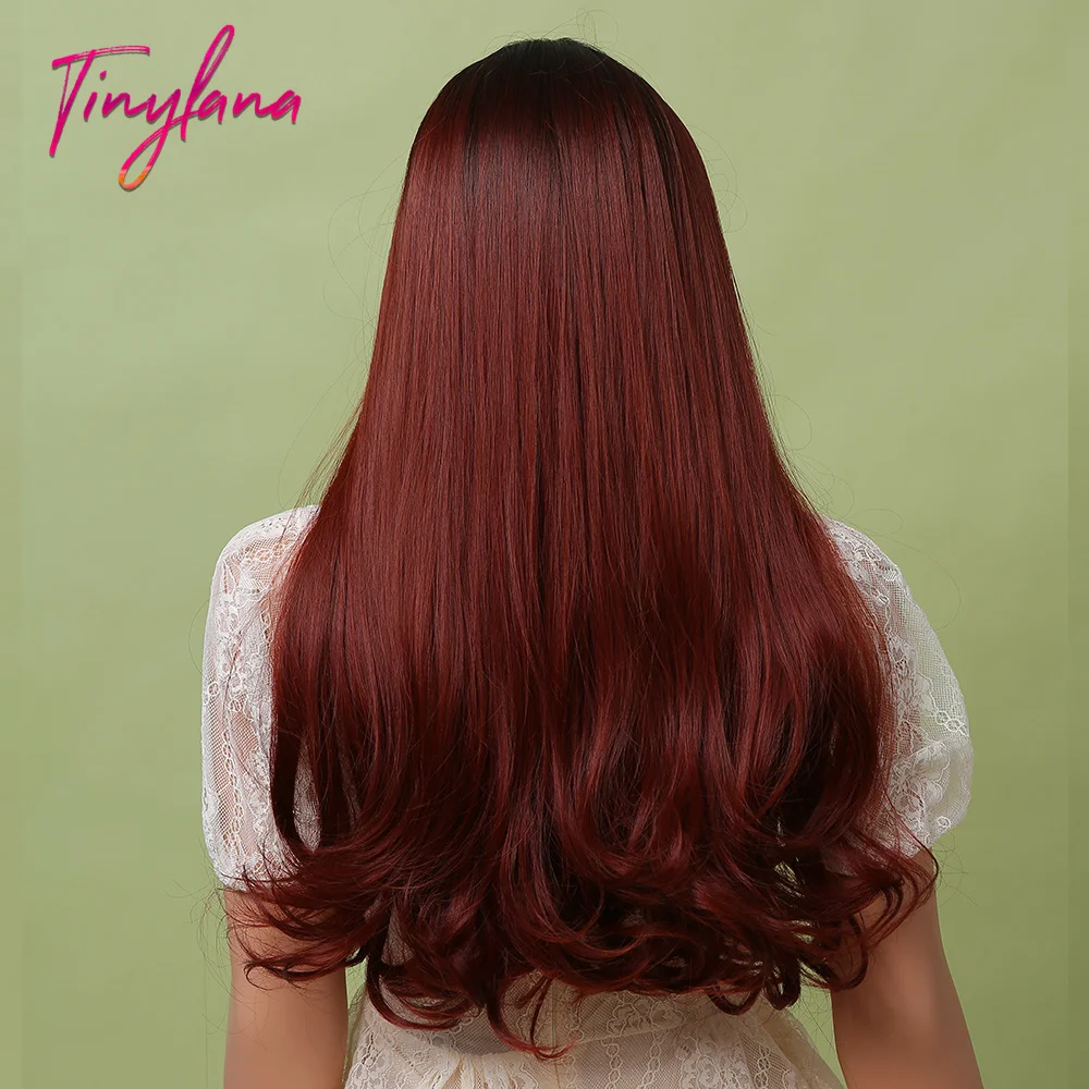 Крошечные парики Ланы с черным корнем красного вина и челкой, длинные волнистые синтетические парики для женщин, косплей, вечеринка, ежедневный женский жаропрочный