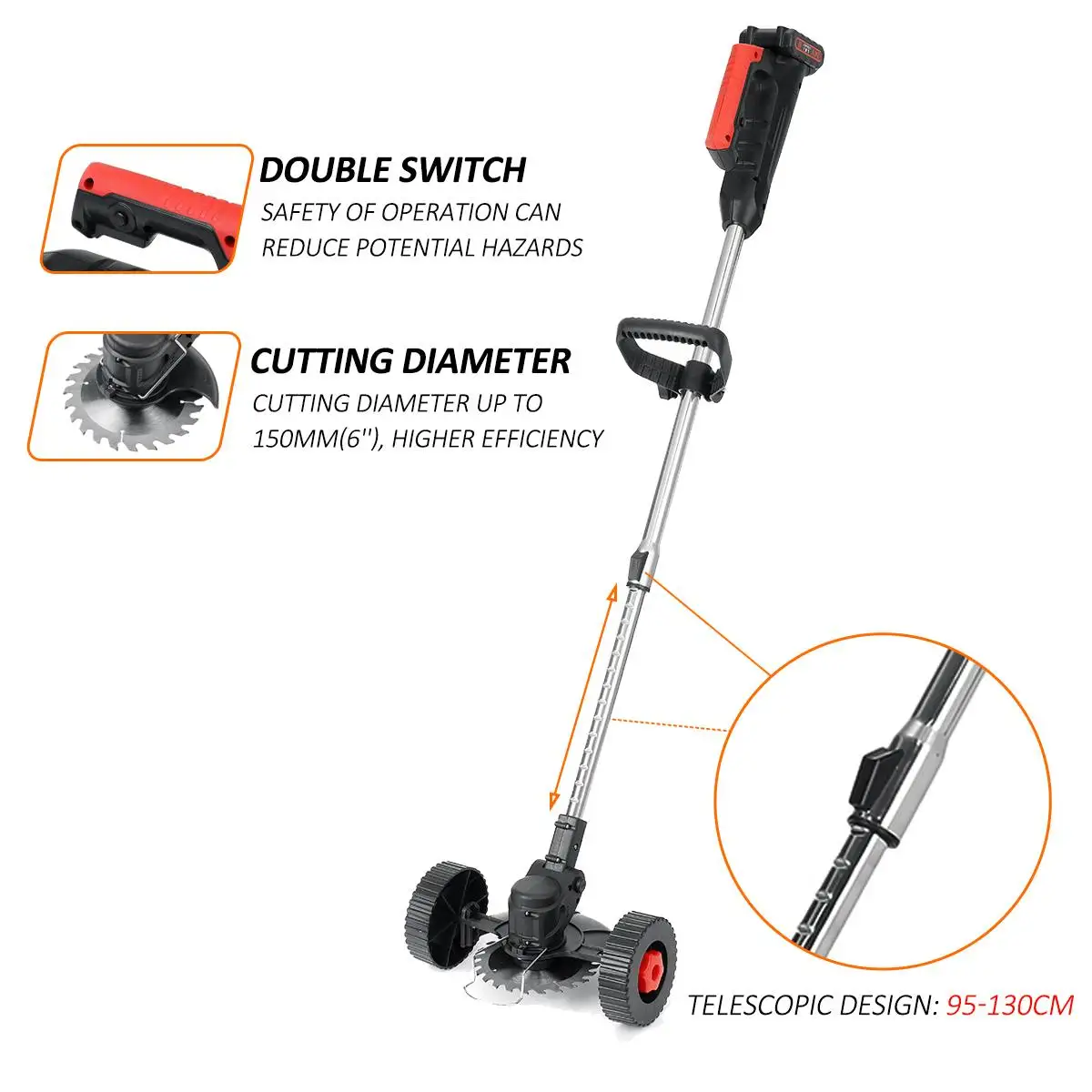 Особенности:-Двигатель из чистой меди, высокая мощность, быстрая скорость.-Провод для предотвращения столкновений, лезвие защитной рамы никогда не прикасается к твердым предметам.-Регулируемая головка машины, без мертвого угла.-Водонепроницаемый Чехол, не легко просачиваться в дождь или розу во время использования.-Диаметр резки, диаметр резки до 150 мм, высокая эффективность.-Удобная вспомогательная ручка, удобная ручка, без ручного трения, положение можно регулировать по желанию.-Двойное переднее колесо, более удобное для работы в течение длительного времени.-Двойная ручка переключателя управления, более удобная работа, высокий коэффициент безопасности.-16-раздел полюс может быть отрегулировано по своему желанию, со степенью расширения и высота может быть отрегулировано по своему желанию в соответствии с потребностями.