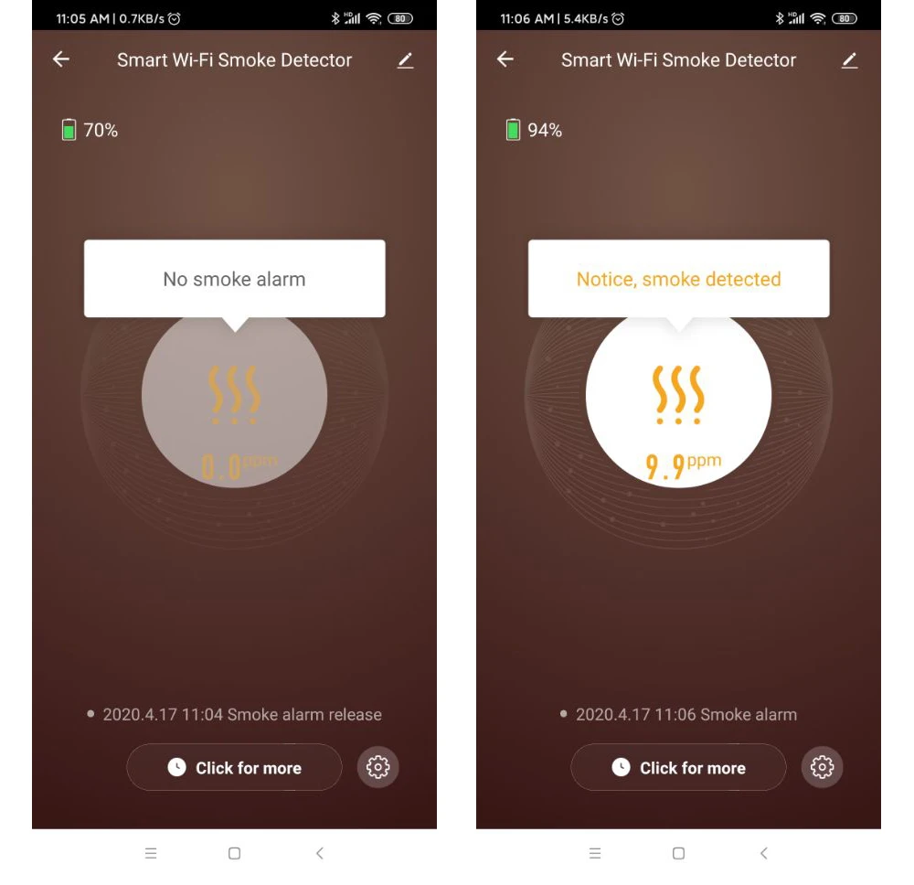 Вы можете проверить питание батареи в приложении, когда заряд батареи слишком низкий, этот дымовой сигнал будит оповещать вас