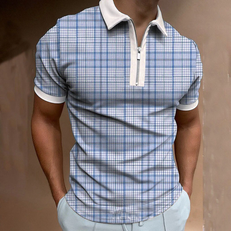 Мужская рубашка-поло, весенняя, повседневная, с отложным воротником, на молнии, с принтом в клетку, с короткими рукавами, 2021