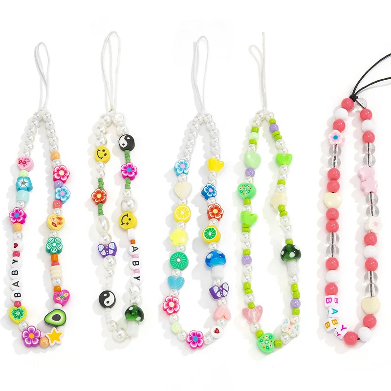 Цветные акриловые бусины с жемчугом, Очаровательная яркая цепочка, универсальный разноцветный ремешок для мобильного телефона, ремешок для защиты от потери, подвеска для телефона
