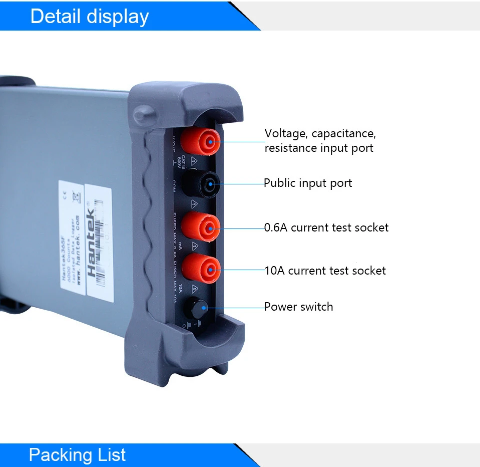 Упаковочный лист:1 * Bluetooth/USB Регистратор данных 365A/B/C/D/E/F1 * CD sofeware1 * пара зонда1 * usb-кабель для подключения1 * Тестовые провода
