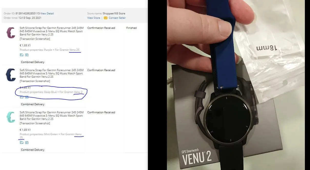Вы отправили неправильный размер ремешка. Я заказал в общей сложности 3 ремешка-два были для модели Venu 2S и один для модели Venu 2. К сожалению, вы отправили все три ремешка для часов Venu 2S. Таким образом, ремешок не подходит для модели Venu 2, см. Фото в приложении.
