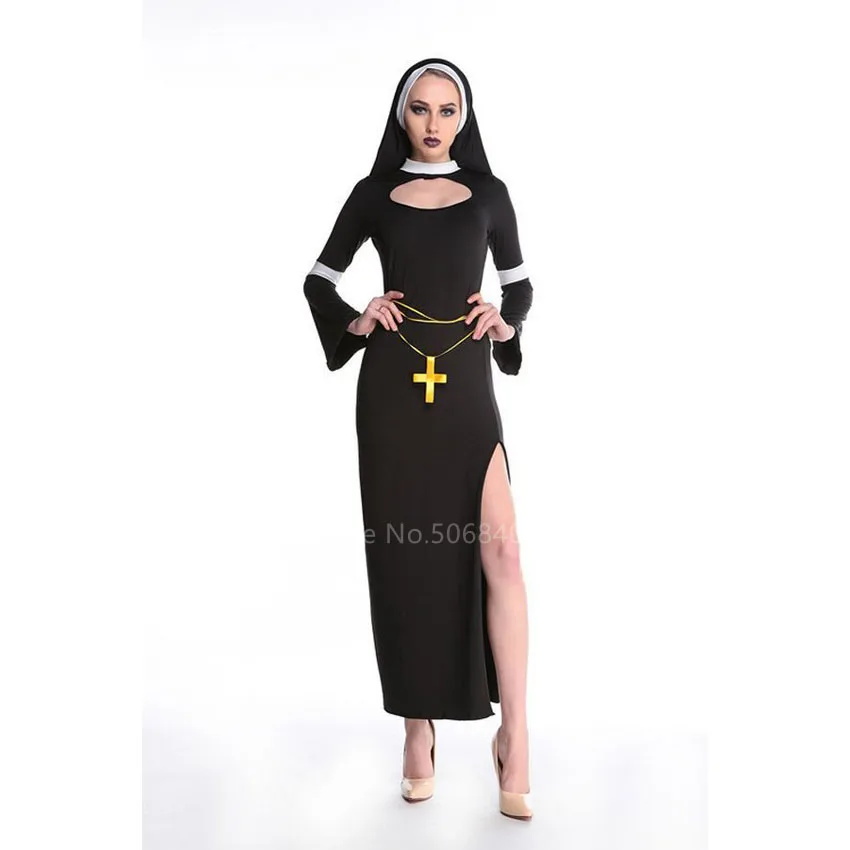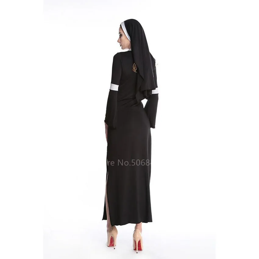 Женский костюм для косплея, черное облегающее платье в готическом стиле с надписью Nun на Хэллоуин