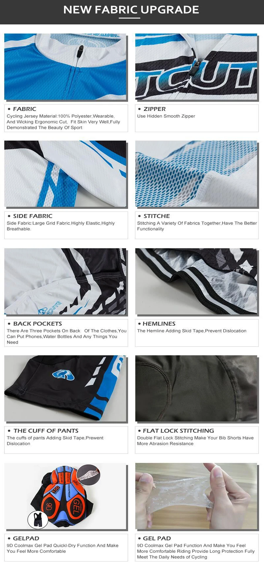Материал: трикотаж (100% полиэстер); Брюки (80% полиэстер и 20% лайкра);Сетчатая ткань: СОчень сильная ударопрочность, хорошая эластичность, устойчивость к истираниюПолная молния и 3 задних пакета.Гелевая накладка COOLMAX: Функция быстрого высыхания позволяет вам чувствовать себя более комфортно.Он может держать вас в сухости и прохладе в горячем состоянииДаже если вы потные, Джерси никогда не прилипает к вашей коже.