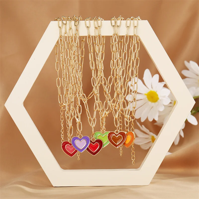 Цвет: цепочка золотого цвета, цветной кулон в виде сердца Особенность: милый любовник, пара собственного дизайна, Двухслойное ожерелье с капельным маслом Материал: сплав металла, капельное масло