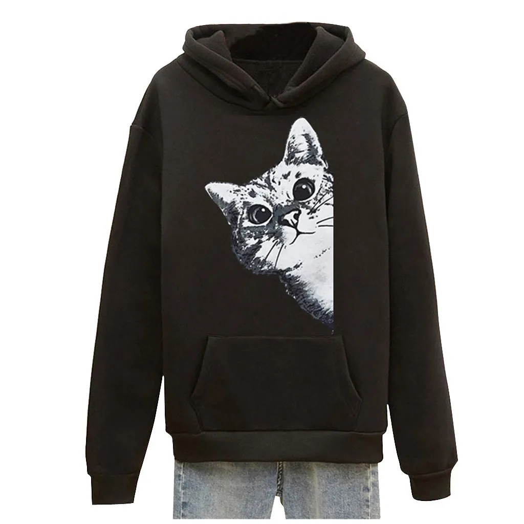 Черные толстовки, Женская толстовка с длинным рукавом, кошачий принт, повседневные толстовки с капюшоном, милый пуловер, свитшот, блузка, Худи Оверсайз