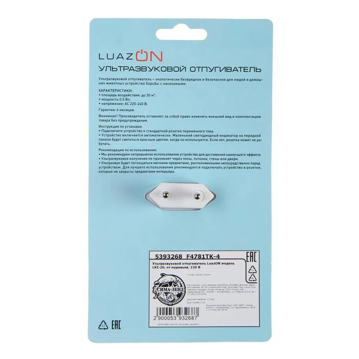 Отпугиватель муравьев LuazON LRI-20, ультразвуковой, 30 м2, 220 В, белый 5393268