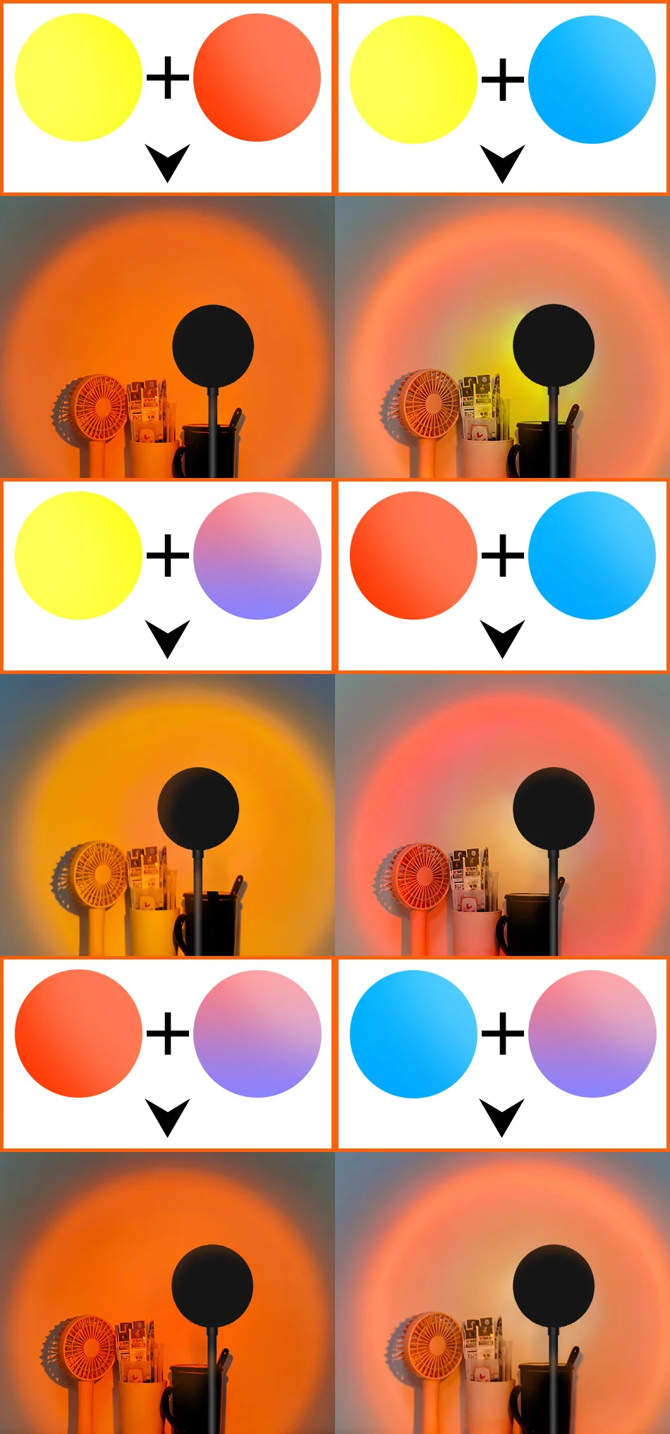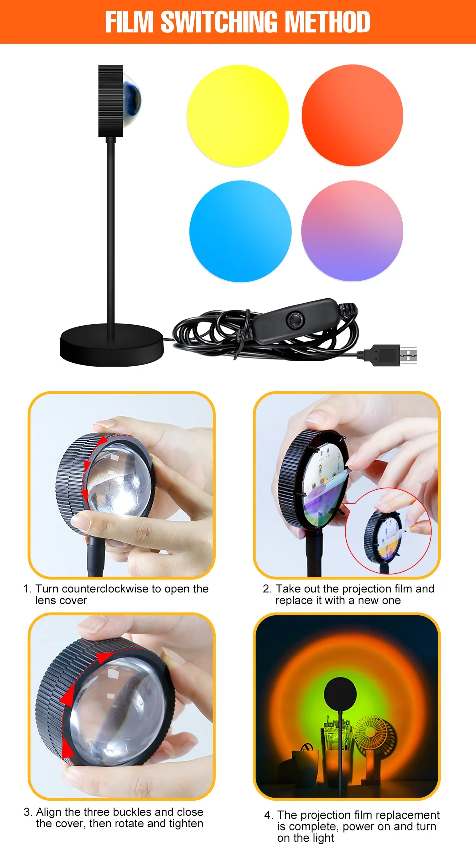 * Есть четыре цветных пленки, которые могут сочетаться с разными цветами в соответствии с личными потребностями. Вы можете использовать одну цветную пленку или несколько цветных пленок для создания разных цветов. Одна лампа может иметь несколько цветов.