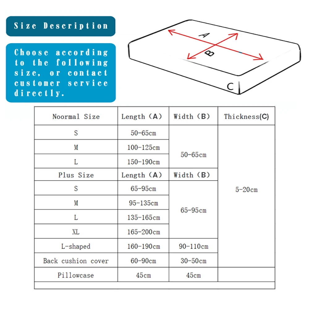 Подходящий размерный ряд: Нормальный Размер 1(S): Длина 50-65 см, ширина 50-65 см, толщина 5-20 см Нормальный размер 2 (м): Длина 100-125 см, ширина 50-65 см, толщина 5-20 см Нормальный Размер 3(L): Длина 150-190 см, ширина 50-65 см, толщина 5-20 см Плюс Размер 1(S): Длина 65-95 см, ширина 65-95 см, толщина 5-20 см Плюс Размер 2 (м): Длина 95-135 см, ширина 65-95 см, толщина 5-20 см Плюс Размер 3(L): Длина 135-165 см, ширина 65-95 см, толщина 5-20 см Плюс Размер 4(XL): Длина 165-200 см, ширина 65-95 см, толщина 5-20 см Г-образный: Длина 160-190 см, ширина 90-110 см, толщина 5-20 см Задняя наволочка: Длина 60-90 см, ширина 30-50 см, толщина 5-20 см Наволочка: 45*45 см