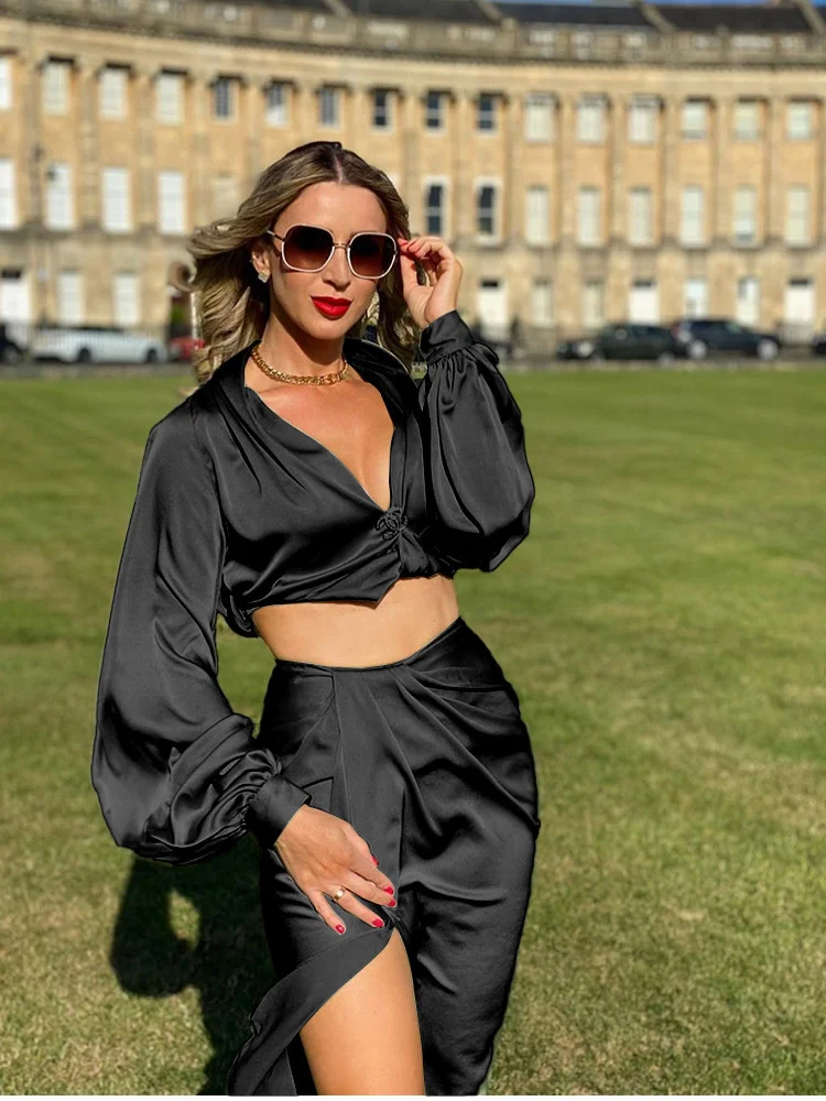 Женские черные подходящие комплекты Шелковый Атласный Драпированный...