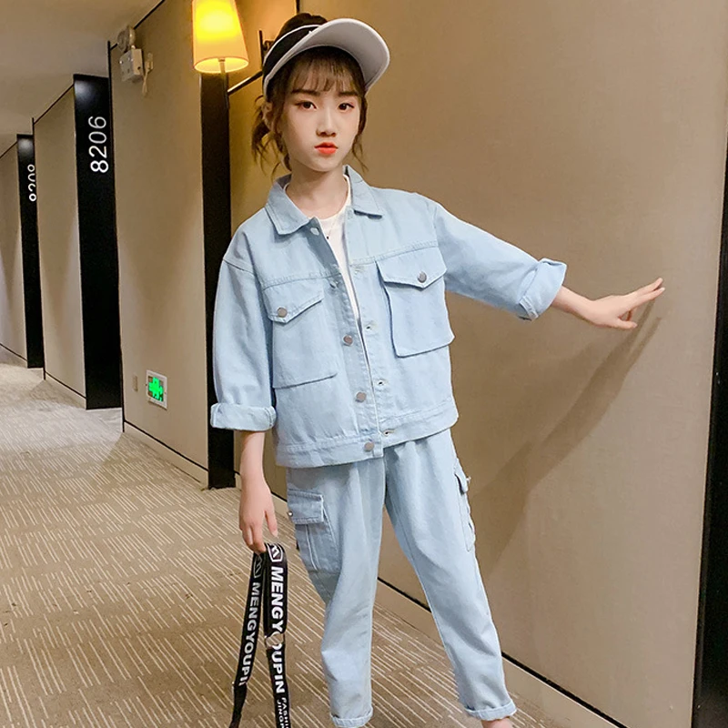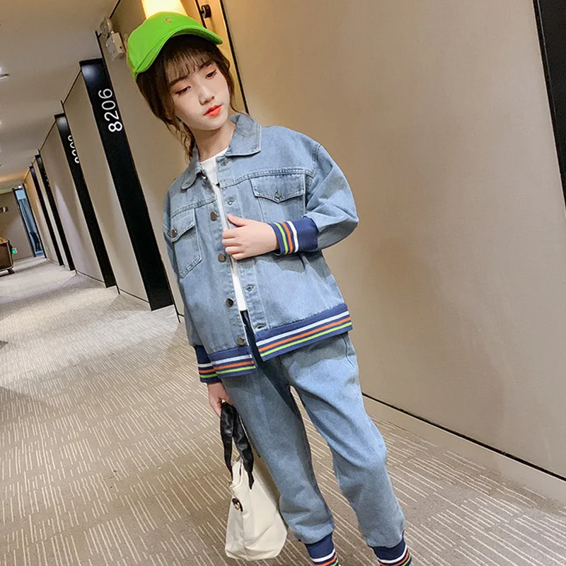 Осенние новые модные комплекты для девочек из 2 предметов, джинсовая простая куртка, топ, повседневные брюки, комплекты одежды для девушек, свитшот, одежда