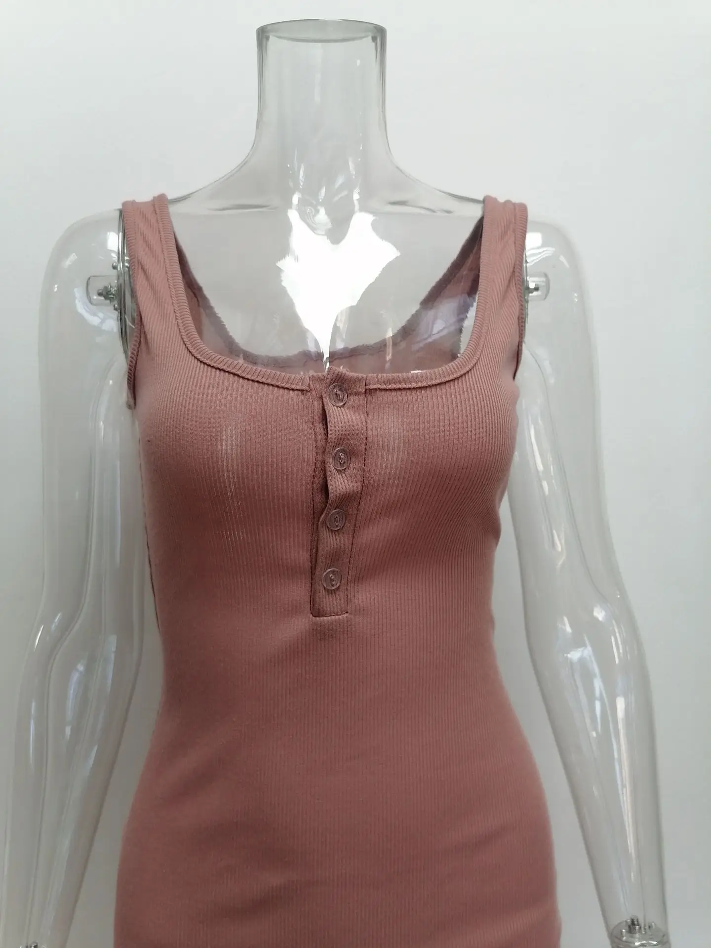 Женское трикотажное платье до колен, элегантное облегающее эластичное платье без рукавов с V-образным вырезом и пуговицами, одежда для вечеринки, лето 2021