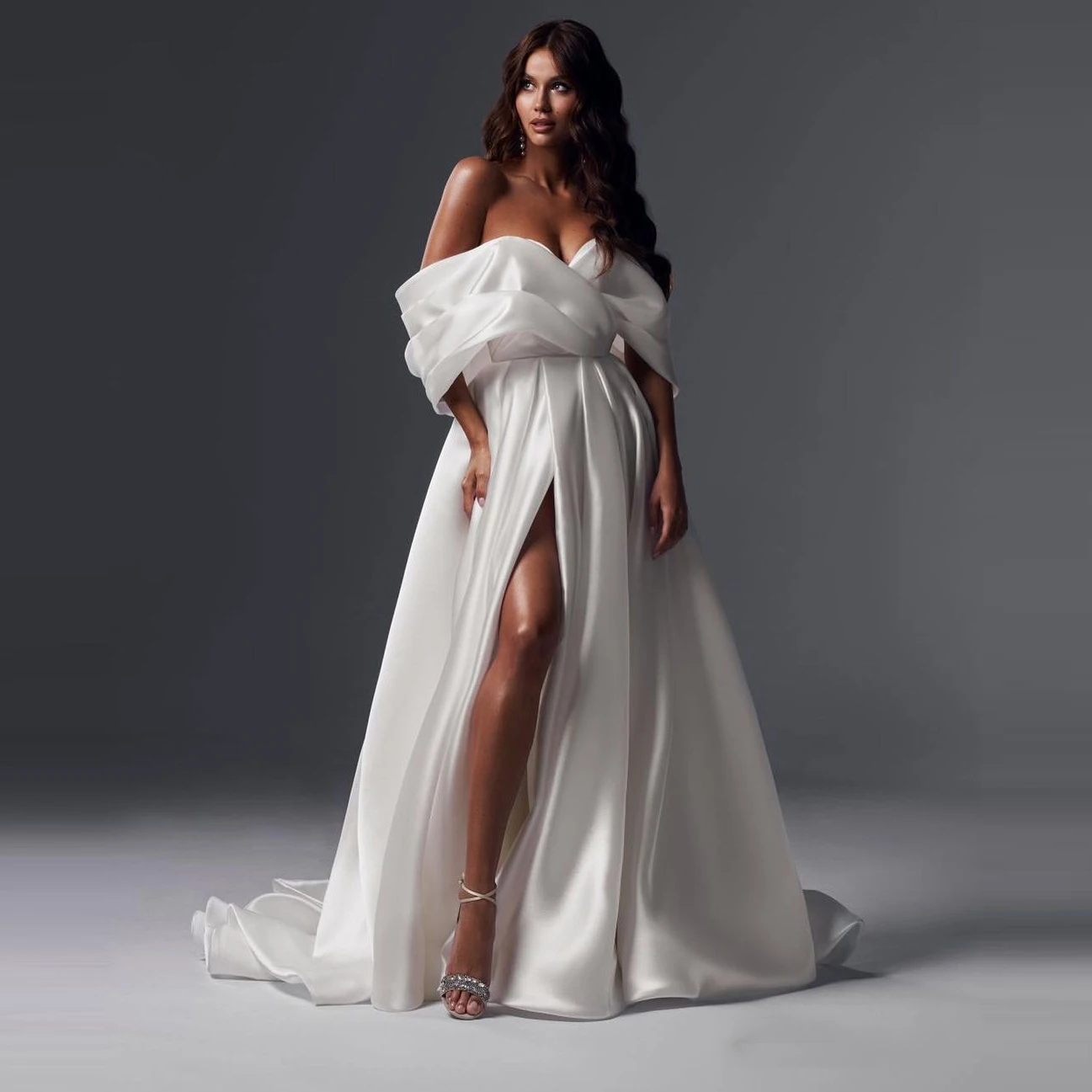 Элегантные атласные свадебные платья, платья невесты с оборками, высоким разрезом и шлейфом, размера плюс