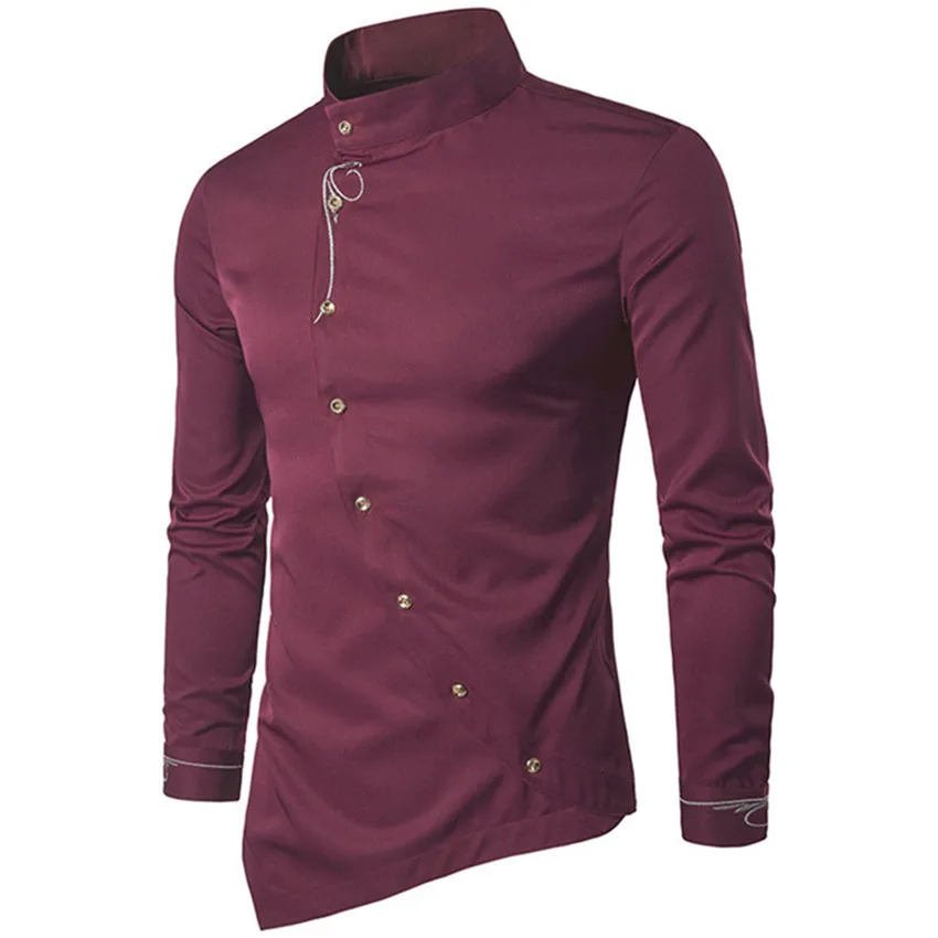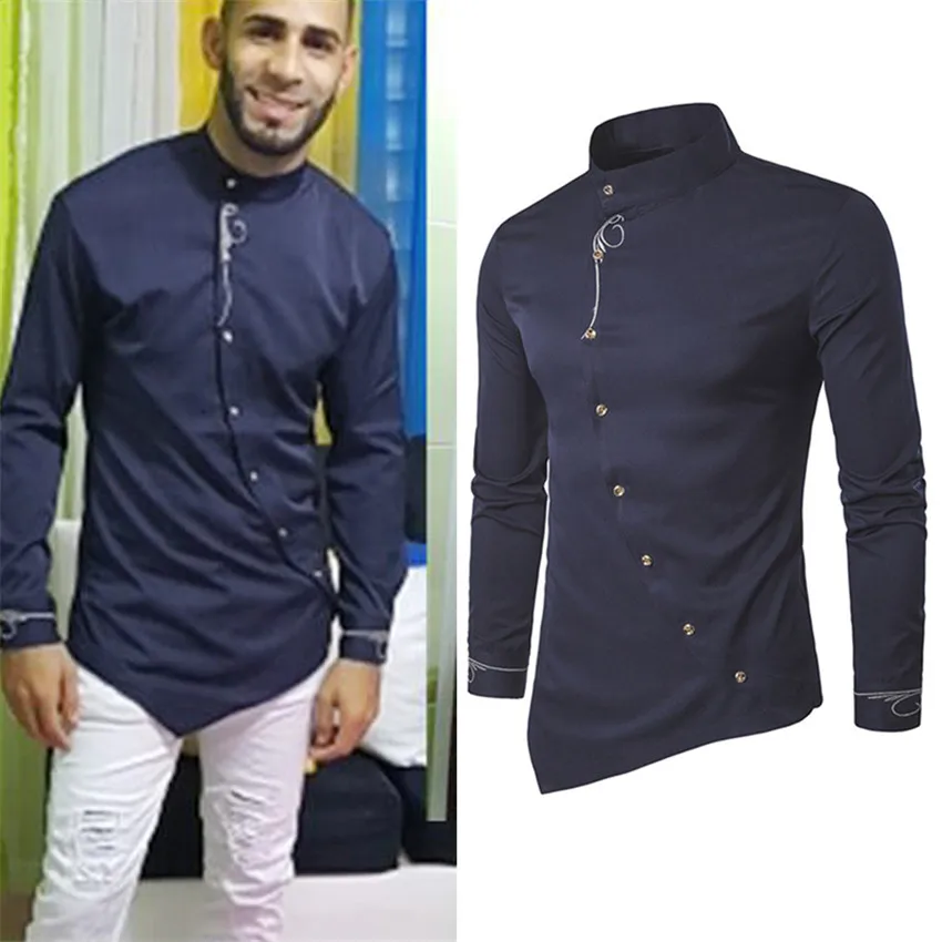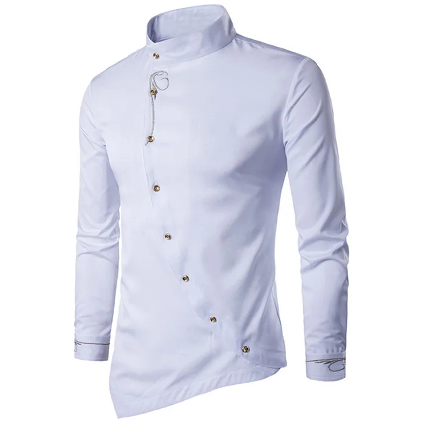 Рубашка мужская с длинным рукавом, однотонная приталенная, повседневная Асимметричная, с вышивкой, модная блузка, 2021