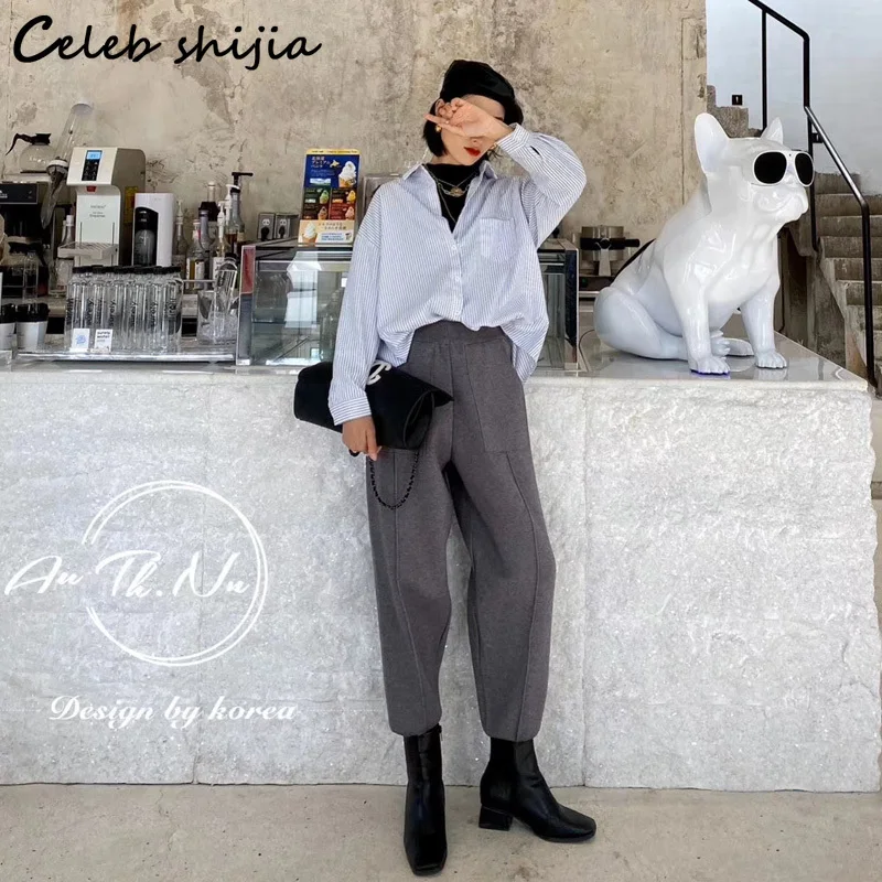 Женские трикотажные шаровары SHIJIA, бежевые серые брюки с высокой талией, модные трикотажные штаны в Корейском стиле для осени и зимы