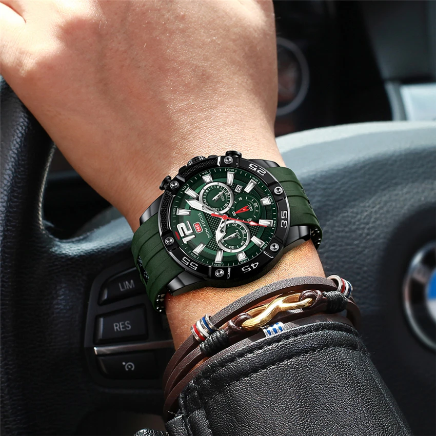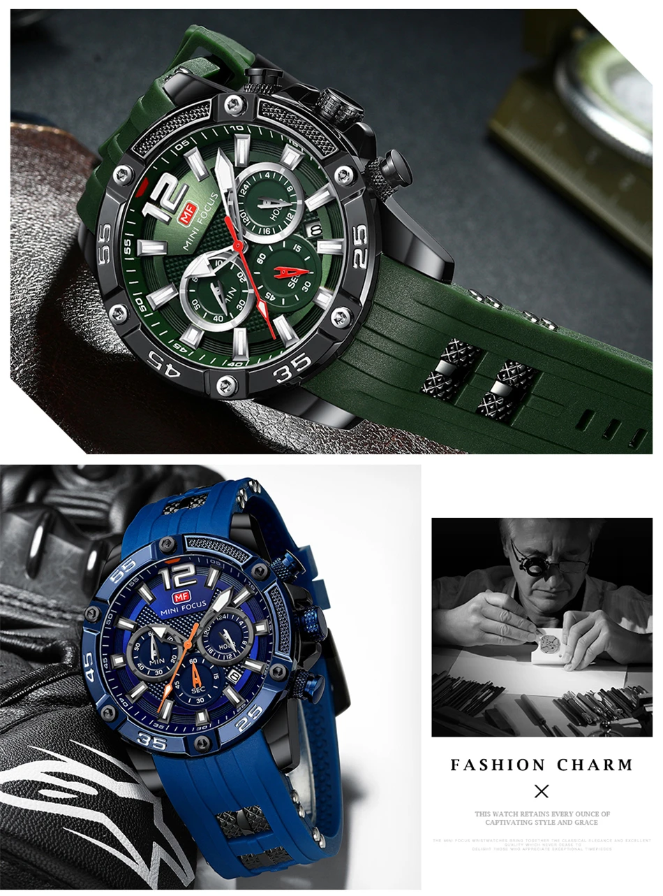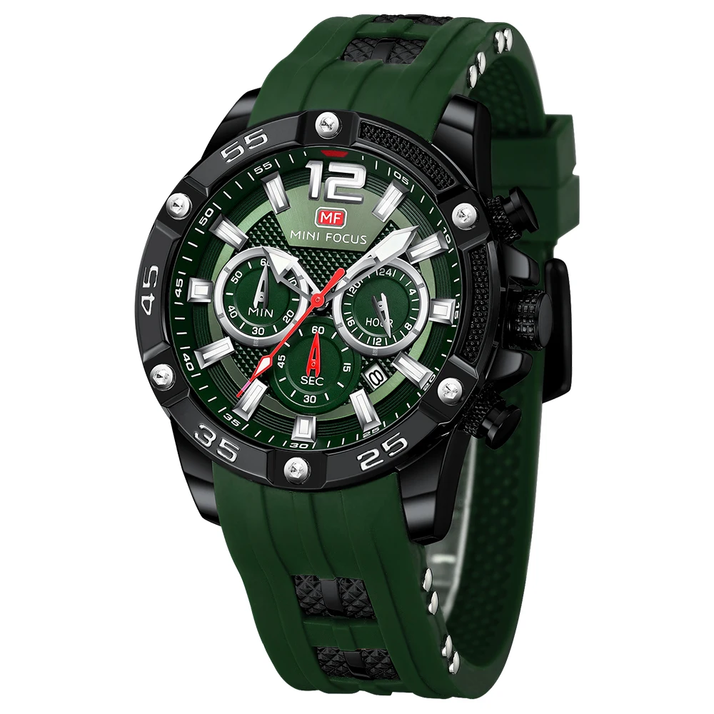 Часы наручные MINI FOCUS Мужские кварцевые, роскошные брендовые водонепроницаемые Модные с зеленым силиконовым ремешком
