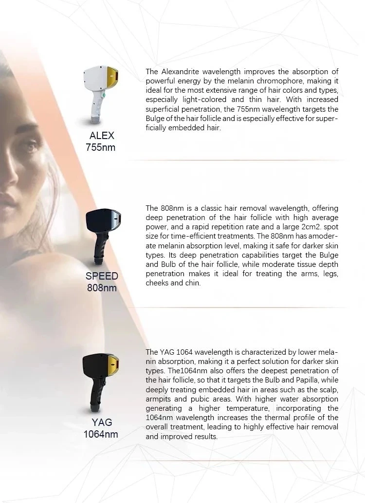 Laser Type:laser hair removal machine, 3 Wave 755/808/1064 laser hair removal machine soprano ice