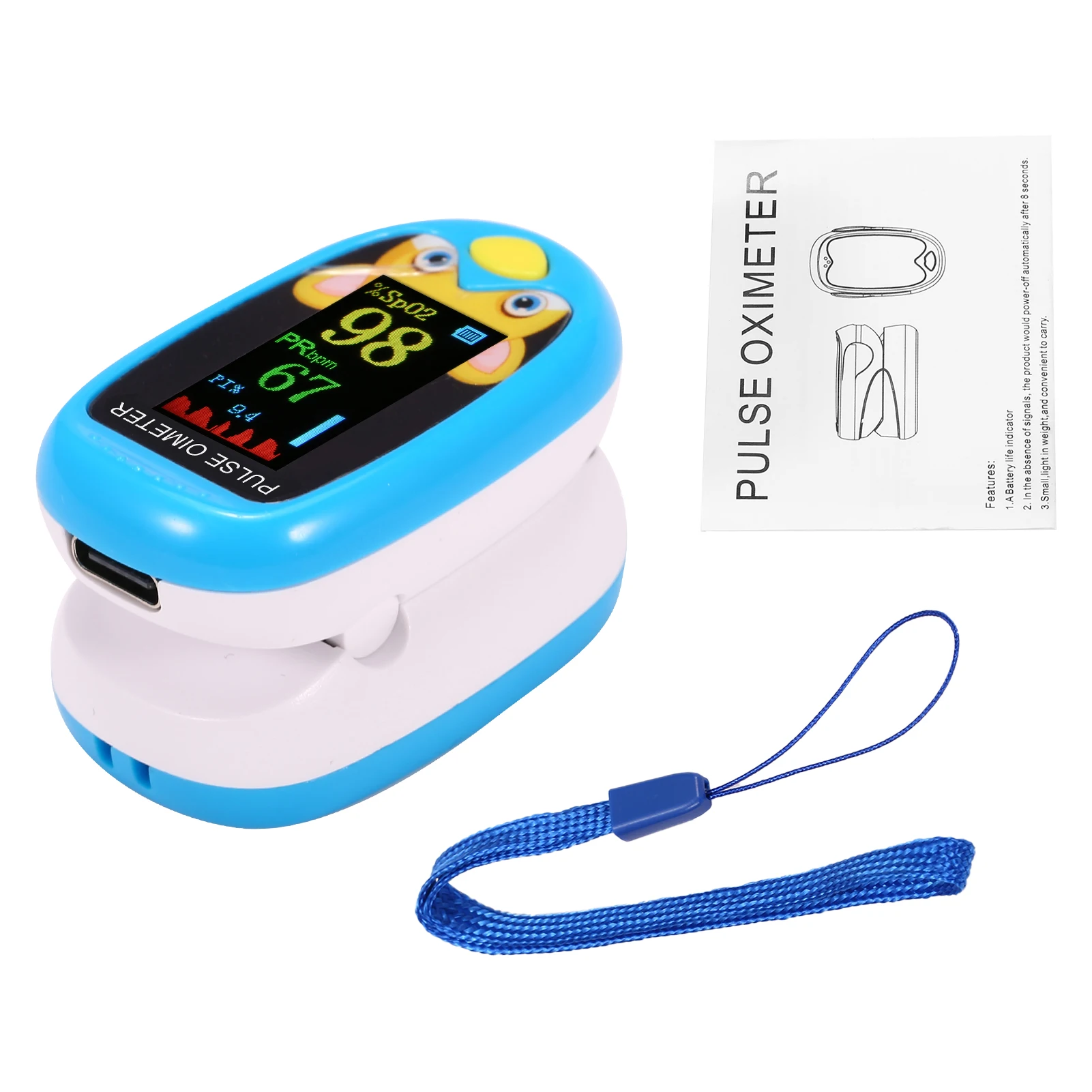 Оксиметр может использоваться для измерения насыщения кислорода, частоты пульса и перфузии через палец. Это специально разработано для детей, мини и мило.Особенности:[Многофункциональный]: пульсоксиметр в основном измеряет насыщение кислородом, частоту пульса и индекс перфузии. Это специально разработано для детей, мини и мило.[Как использовать]: Включите пульсоксиметр, положите один из ваших пальцев в резиновое отверстие оксиметра. Затем отпустите зажим, нажмите кнопку, оксиметр перейдет в рабочее состояние. Оксиметр автоматически попадает в режим ожидания или сна через 8 секунд без пальца.[Более быстрый Дисплей: оксиметр использует передовые технологии зондирования, результаты испытаний будут отображаться на экране после 5s. Не нужно ждать.[TFT дисплей]: низкое энергопотребление, TFT прозрачный дисплей, 4 направления можно регулировать для удобного чтения. Удобный и компактный, портативный для дома или путешествий.[Гарантия]: Если возникнут какие-либо проблемы, пожалуйста, своевременно свяжитесь с нашим магазином. Мы дадим вам удовлетворительное решение.Характеристики:Товар: Пульсоксиметр для детейТип дисплея: TFT дисплейЦвет на выбор: желтый, синий, красныйДиапазон измерения SpO2: 70%-99% (разрешение 1%)Точность SpO2: ± 2% на этапе 80%-99%, ± 3% на этапе 70%-79%, бесполезно на этапе ниже 70%Диапазон измерения PR: 30 bpm-240 BPMТочность PR: 1 BPMБатарея: 3,7 V 200MAHОсновной Материал: АБС-пластикРезультаты тестирования: 5SАвтоматическое отключение: 8SТовар Размеры: 4,6*2,8*2,7 смРазмер посылка: 7,6*5,5*3,7 смПосылка Вес: 29 грПримечание:* Не используйте устройство, если он влажный или влажный из-за конденсации или разлива. Избегайте использования оборудования сразу же после его перемещения из холодной среды в теплое, влажное место.* Лак для ногтей или поддельные ногти могут привести к неточным показаниям SpO2.* Измерение SpO2 может отрицательно повлиять на высокий окружающий светильник. Закройте зону датчика от прямых солнечных лучей (например, полотенцем) при необходимости.* Возможны некоторые отклонения из-за ручного измерения или небольшой разницы в цвете из-за условий фотографирования. Спасибо за понимание.Упаковочный лист:1 * Пульсоксиметр для детей1 * ремешок1 * Руководство пользователя (на английском языке)