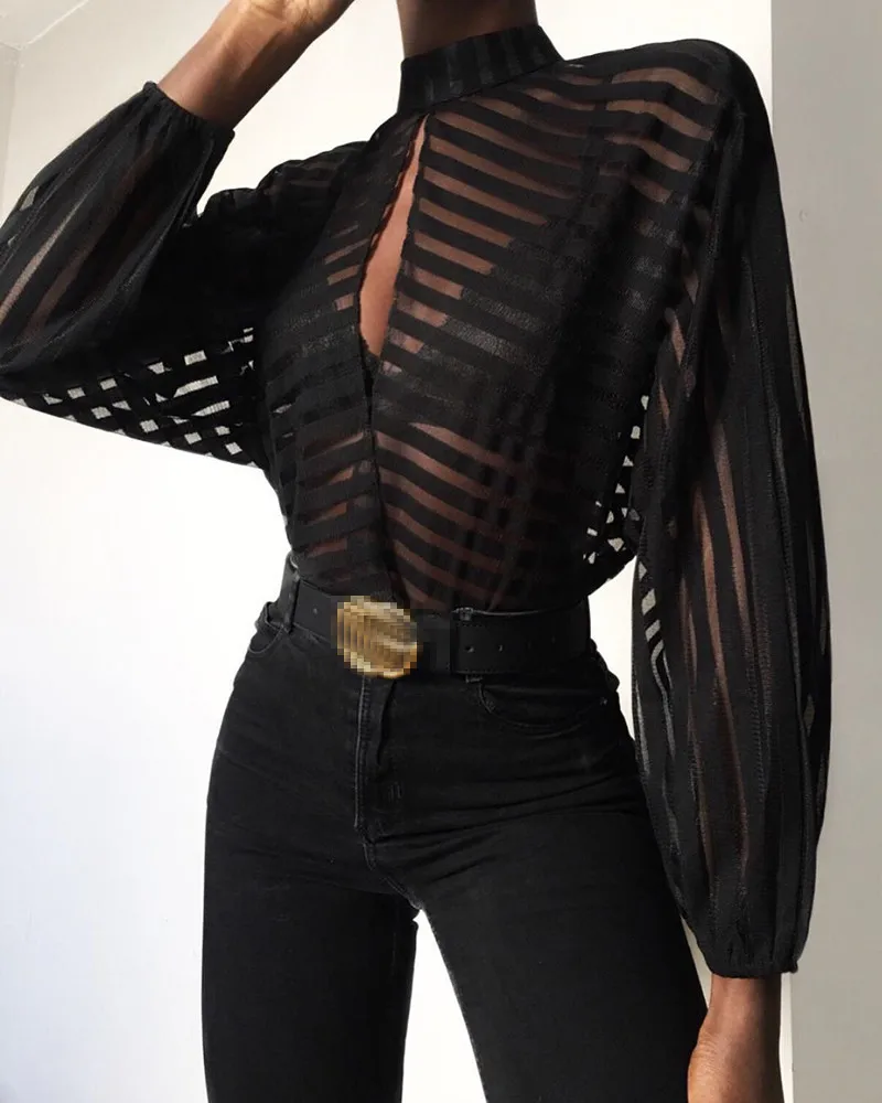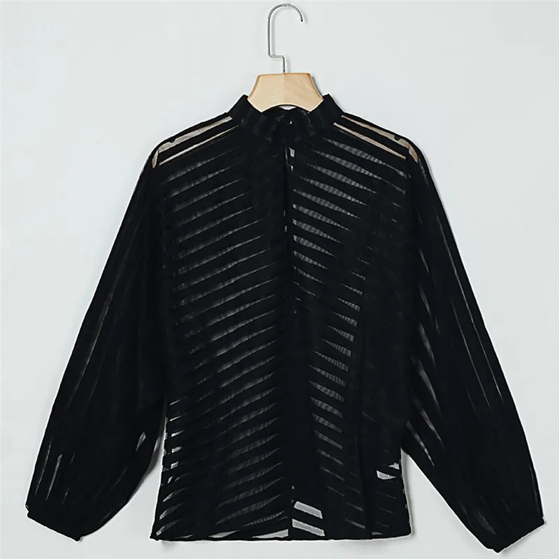 Hirigin, Новая женская сетчатая блузка в сетку, прозрачная рубашка с длинными рукавами, блузки, топы, верхняя одежда, OL, Женская Черная открытая рубашка спереди, 2019