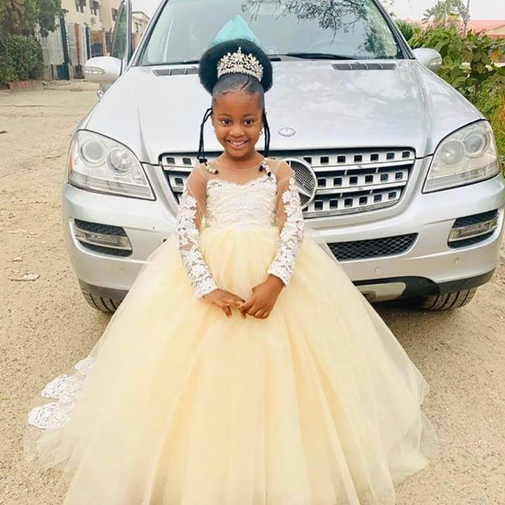 Фатиновые платья для девочек с круглым вырезом и аппликацией трапециевидного силуэта, платья с длинными рукавами и цветами для девочек, детская официальная одежда, детское праздвечерние чное платье, платье
