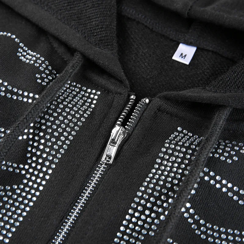 Толстовка Стразы в стиле Харадзюку на молнии с капюшоном, худи в готическом стиле, Женская винтажная куртка с капюшоном, уличная одежда, толстовка на молнии