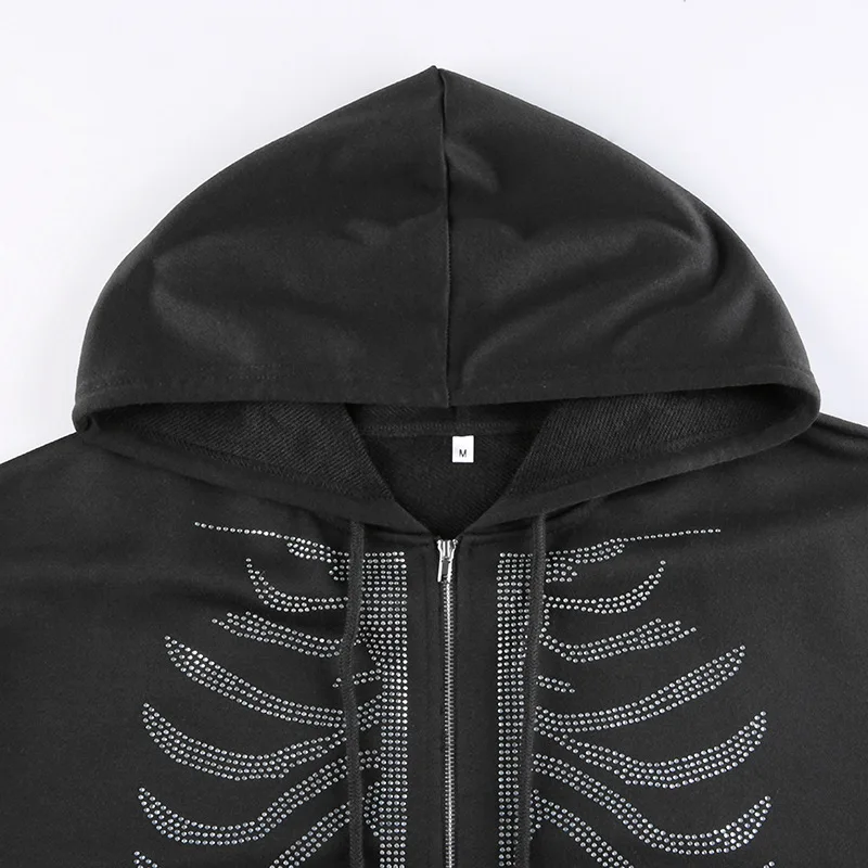 Y2K Стразы худи скелет Женская Осенняя уличная одежда на молнии гот...