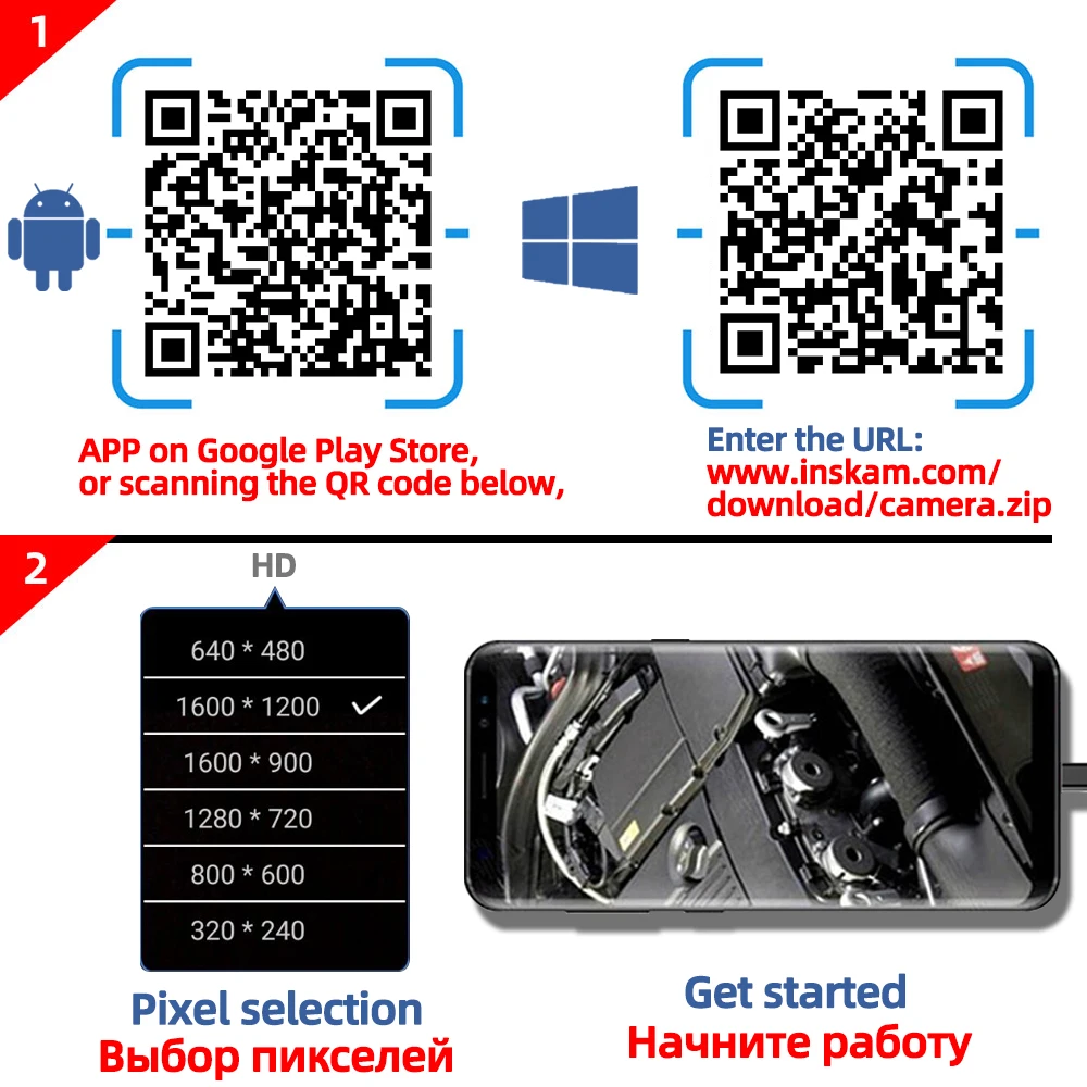 Как использовать на мобильных телефонах Android①Скачать приложение: Поиск "камера fi"Приложение в Google Play Store, или сканирование qr-кода ниже, или введите URL:Https://www.inskam.com/download/inskam.apk②Установите приложение на телефон.③ Подключите эндоскоп к телефону, затем вы можете использовать его.Как использовать в системе Windows①Enter URL:Http://www.inskam.com/download/camera.zipДля downlad диск "Smart Camera".②Install накопителя в ПК③ Подключите продукт к ПК, откройте диск "Smart Camera". Вы можете начать использовать этот продукт.