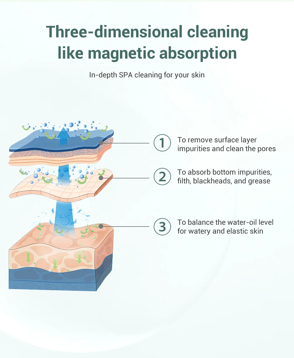 Трехмерная очистка, как магнитное поглощениеВ глубине спа Чистка для вашей кожиДля удаления примесей поверхностного слоя и очистки порДля поглощения примесей, грязи, черных точек и жира