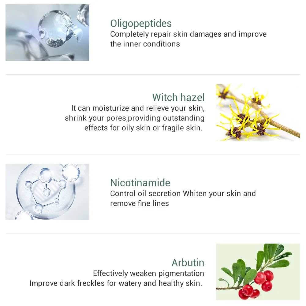 Несколько отбеливающих ингредиентовЯркая и нежная кожаНикотинамидКонтроль секреции маслаОтбеливает кожу и удаляет тонкие линииАрбутин,Эффективно ослабляет пигментацию
