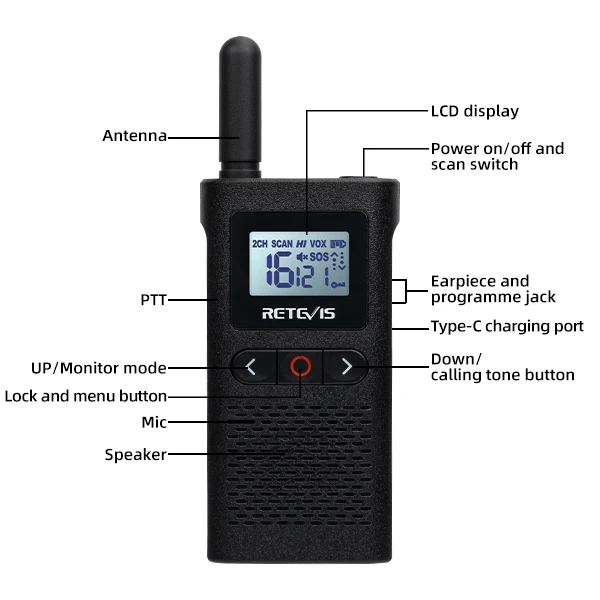 1. Беслицензионная частота PMR446/FRS2. Разработан с VOX hands free, поддерживает PTT push для разговора и голосовой активации разговораЛитий-ионный аккумулятор емкостью 3,1500 мА · ч может прослужить весь день, когда он будет полностью заряжен; Функция оповещения о низком заряде батареи помогает вам держать рации всегда в мощности4. С экраном 1,28 дюйма и кабелем для зарядки Type-c (1 на 2).