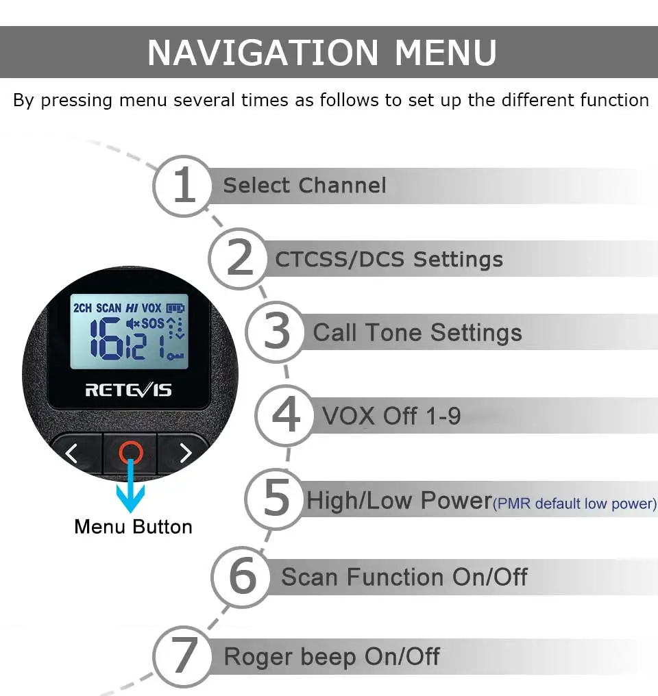 1. Таймер таймера (TOT)2.VOX Функция3. Блокировка канала4. Блокировка клавиатуры (Авто/ручной)5. Уровень шумоподавления (0-9 классов)6. Функция автоматического энергосбережения7. Аудио Compand8. Функция мониторинга9.CTCSS/DCS кодирование/декодирование10. Индикация низкой мощности/сигнализация11. Функция сканирования12. Мелодия вызова (10 групп)13,2-pin K вспомогательный порт