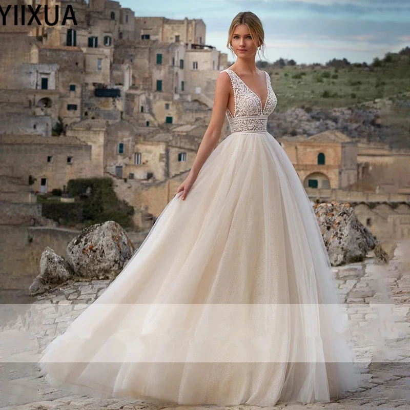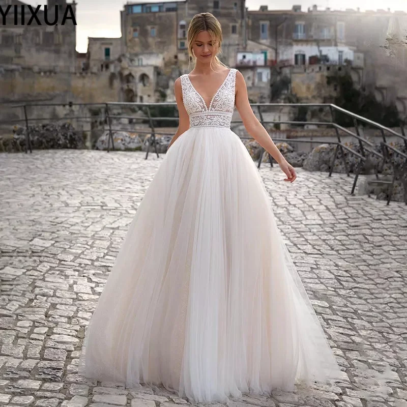 YiXuan очаровательное мягкое Тюлевое изящное кружевное ТРАПЕЦИЕВИДНОЕ длинное свадебное платье без рукавов с V-образным вырезом и аппликацией с открытой спиной 2021