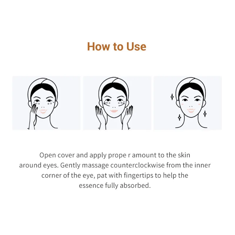 Откройте крышку и нанесите необходимое количество на кожу вокруг глаз. Мягко массируйте против часовой стрелки от внутреннего угла глаза, погладьте кончиками пальцев, чтобы полностью впитать эссенцию.