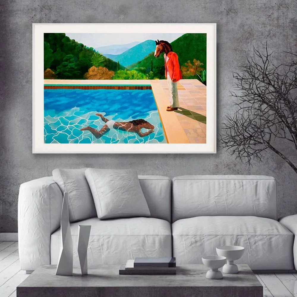Принты Bojack, плакат в стиле Дэвида хокни, две лошади, плавательный бассейн, Картина на холсте, настенное искусство, мультяшная картина, декор для гостиной