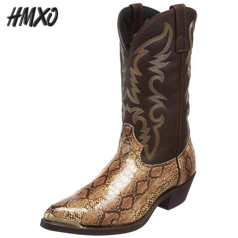 Ковбойские ботинки HMXO с острым носком, мужские ботинки на высоком каблуке, трендовые простроченные ботинки со змеиным принтом, мужская повседневная кожаная обувь