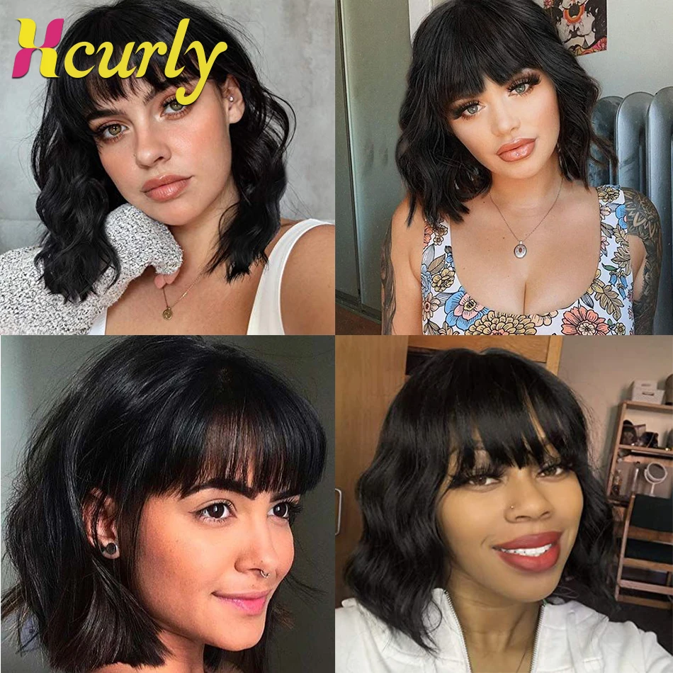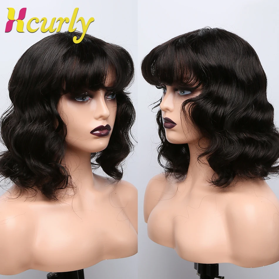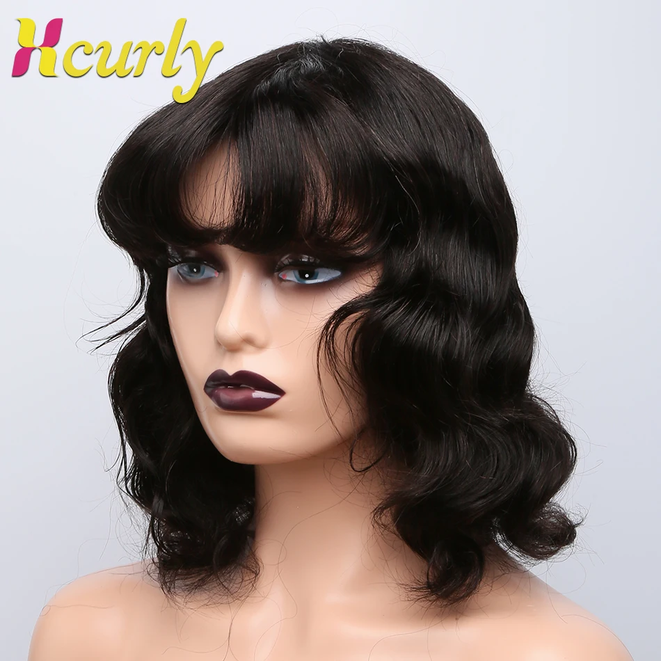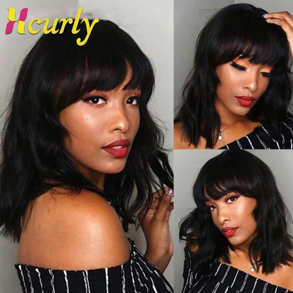 Парик Боб с челкой, короткий волнистый парик из человеческих волос, бразильские волосы, парики для женщин, безклеевые, полностью автоматические парики, Remy, человеческие волосы
