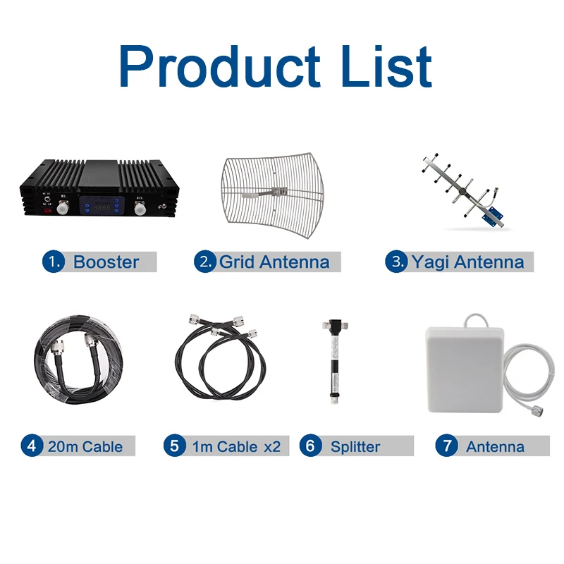 1. 900 2100 усилитель сигнала2. 24dBi сетевая антенна3. 8dBi Yagi антенна4. Кабель 20 м5. 1 м кабель x26. 2-полосная разветвитель7. Плоская антенна
