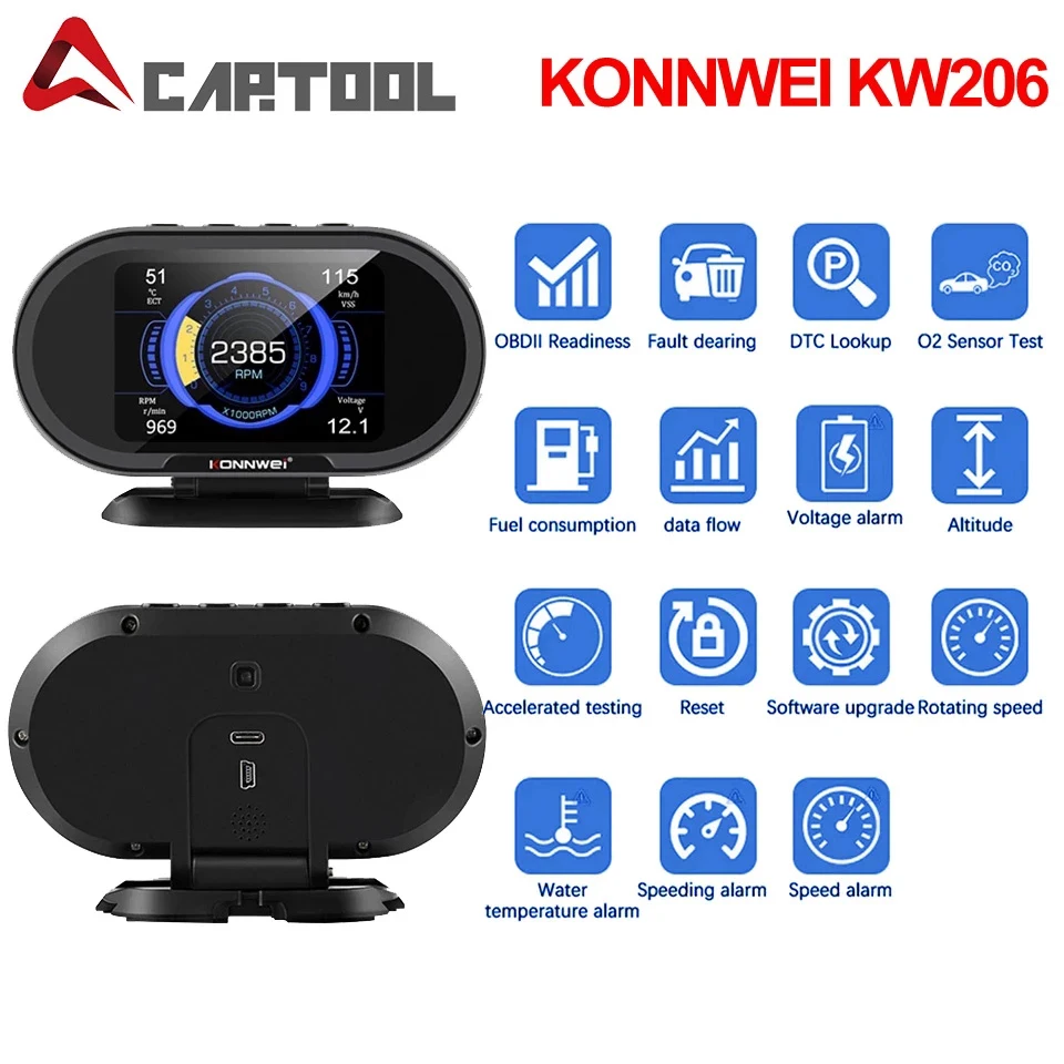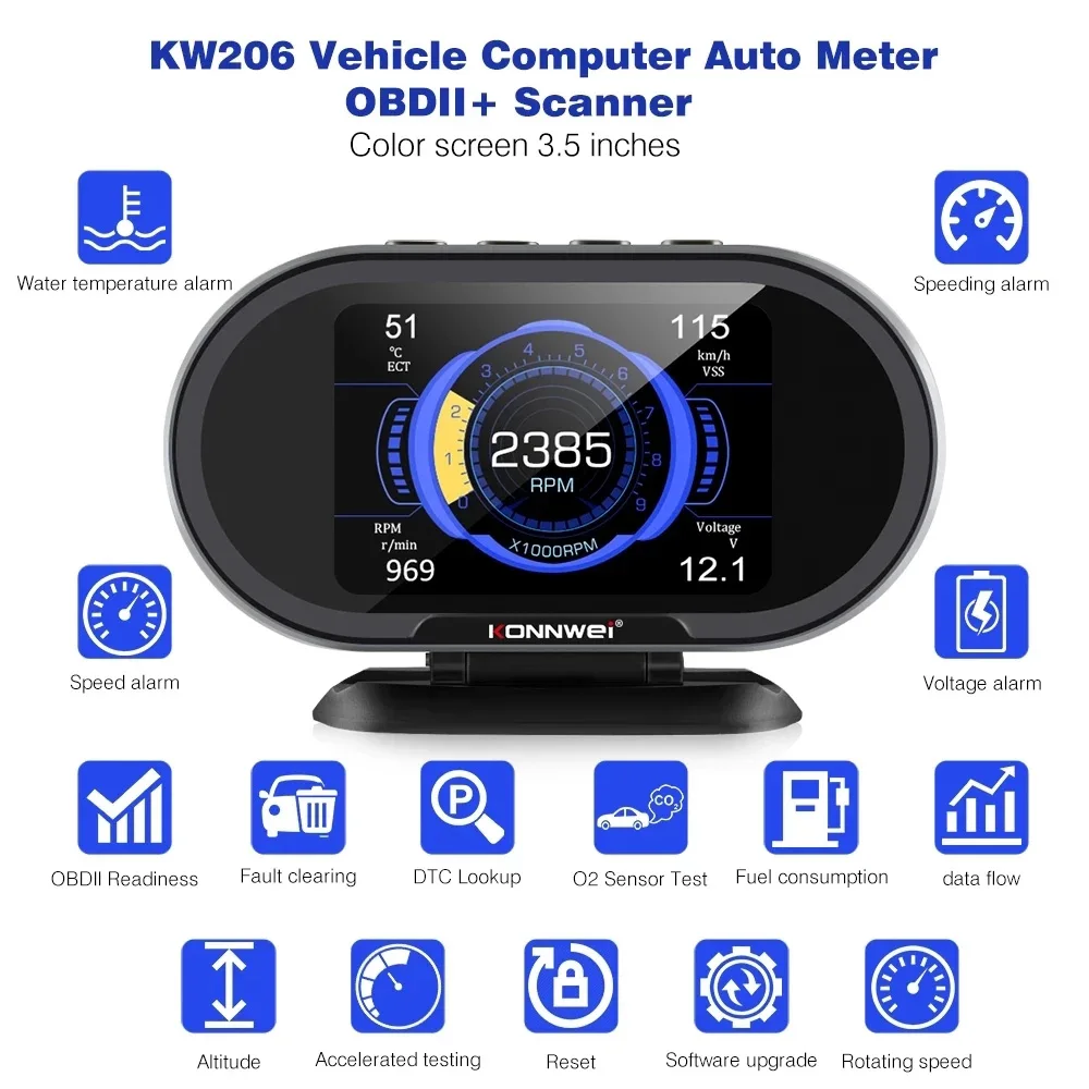 Компьютер KONNWEI KW206 OBD-это умный и мощный автоматический измеритель. Он специально разработан для транспортных средств, чтобы показать все данные в реальном времени на одном экране, это сочетание спидометра, датчика температуры двигателя, масляного термометра, манометра, счетчика расхода топлива и так далее.