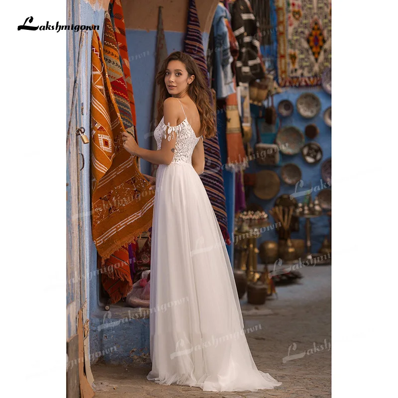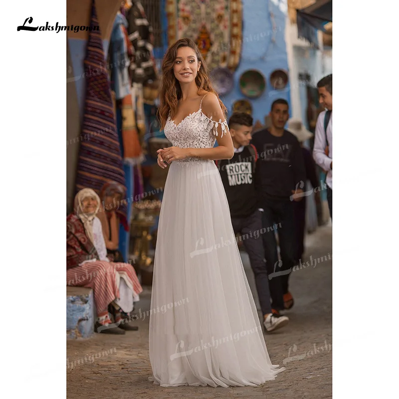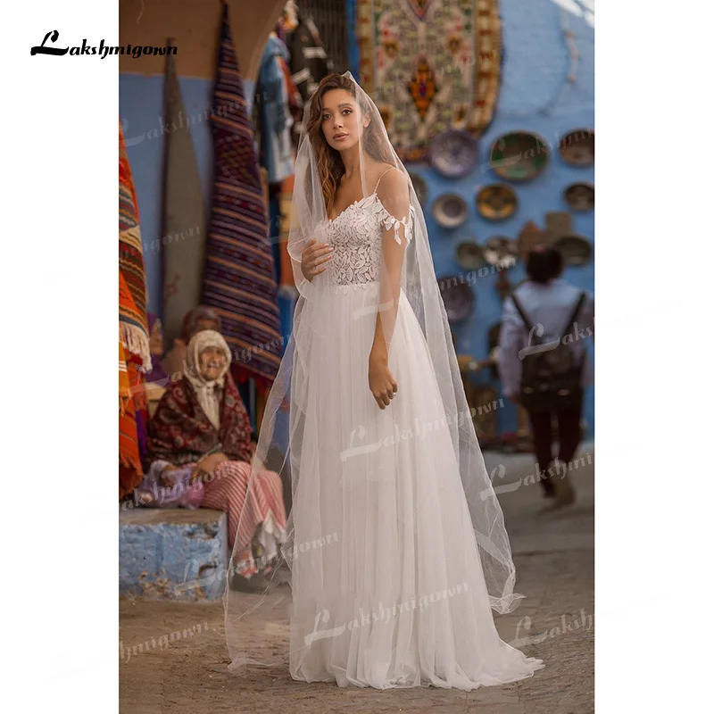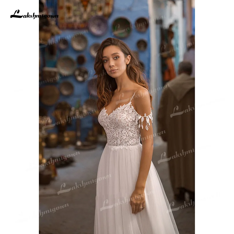 Платье Свадебное ТРАПЕЦИЕВИДНОЕ с открытыми плечами, Тюлевое с V-образным вырезом, на бретелях-спагетти, без рукавов, с открытой спиной, Кружевная аппликация, со шлейфом, наряды для невесты