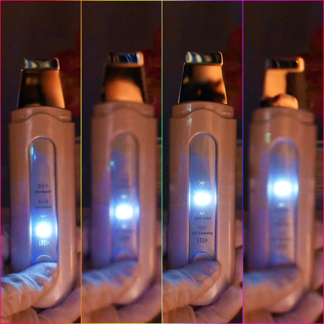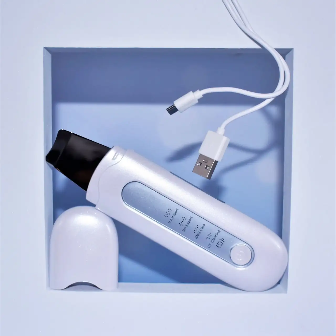 Люблю этот прибор, очищает поры, позволяя каждой поре дышать. Очищение пор позволяет коже более эффективно поглощать питательные вещества, восстанавливать здоровье. Четыре ультразвуковых режима: режим очистки надо использовать с очищающим средством, EMS-массаж с кремом для овала лица, экспорт (+)ионов с тонером или лосьоном, импорт (-)ионов с сывороткой, эмульсией. Кожа не должна быть сухой! Это важно, иначе не будет работать. Двигать лопатку надо медленно под углом 45 грасов к коже, не останавливать где-либо на лице. Прибор лёгкий, удобно лежит в руке, 4 режима подписаны, управляются одной кнопкой коротким нажатием, нажатие 2 сек – вкл/выкл. Скрабер беспроводной, зарядка через USB, мигает красным индикатор зарядки во время заряда и отключается, когда заряжено. Весь комплект в твёрдой картонной коробке презентабельного вида и включает: прибор, пылезащитный колпачок, USB кабель, инструкцию. Мне нравится пользоваться. Спасибо