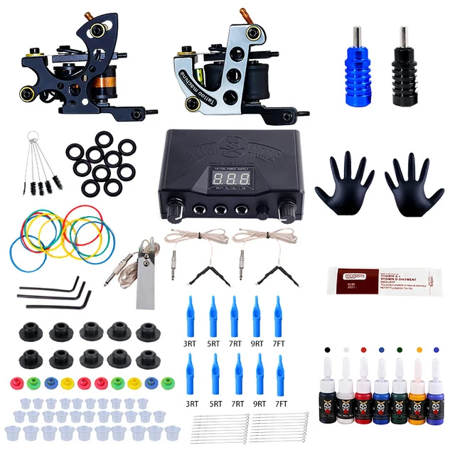 Полный набор тату-машинок с катушкой, набор тату-машинок, электропитание, иглы, профессиональный набор тату-машинок для начинающих1. 2X тату-машинки для вкладышей и шейдеров, 10 оберток катушки2. 1X блок питания для татуировки с ЖК-дисплеем3. 2X тату-ручки4. Чернила для тату 7x5 мл5. 10 тату-игл6. 10 насадок для тату7. 1X ножная педаль для татуировки8. 1X шнур для татуировки9. Другие принадлежности для татуировок