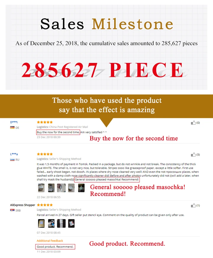Веха продажПо состоянию на 25 декабря 2018 года совокупный объем продаж составил 285627 шт.Те, кто использовал продукт, говорят, что эффект потрясающий.