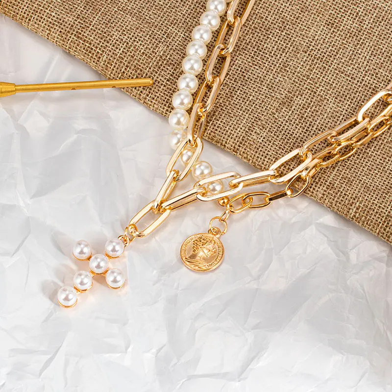 Винтажное богемное многослойное жемчужное ожерелье с крестом для женщин цепочка с замком монета с портретом подвеска чокер 2021 женские свадебные ювелирные изделия