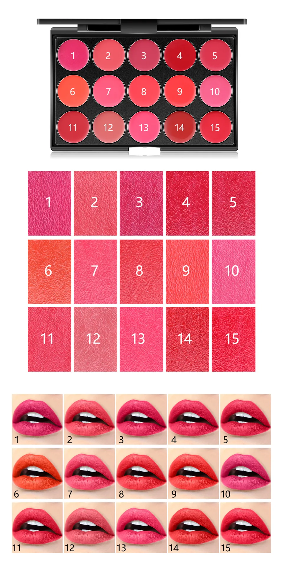 Палитра матовой помады, 15 цветов, водостойкая, увлажнитель длитель...