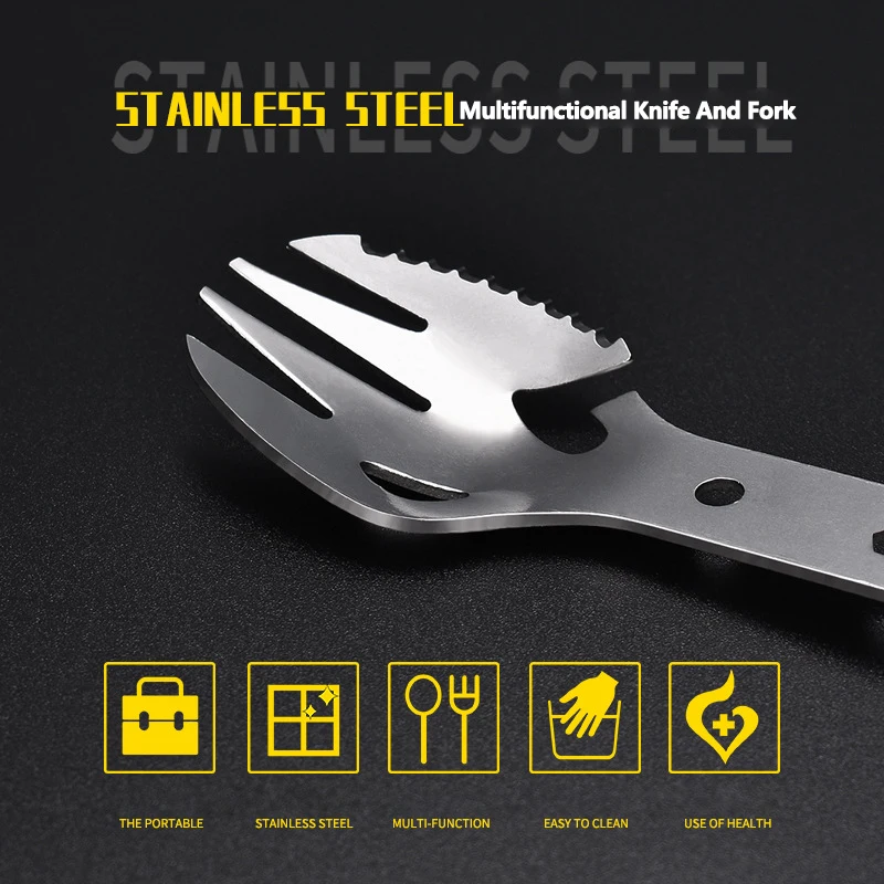 1. Открытый многофункциональный инструмент с консервным баком и открывалкой для бутылок, ложкой, вилкой, идеально подходит для активного отдыха.