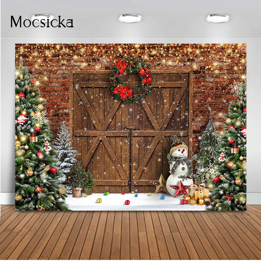 Фон для студийной фотосъемки с изображением рождественской снежной сцены, кирпичной стены, двери сарая