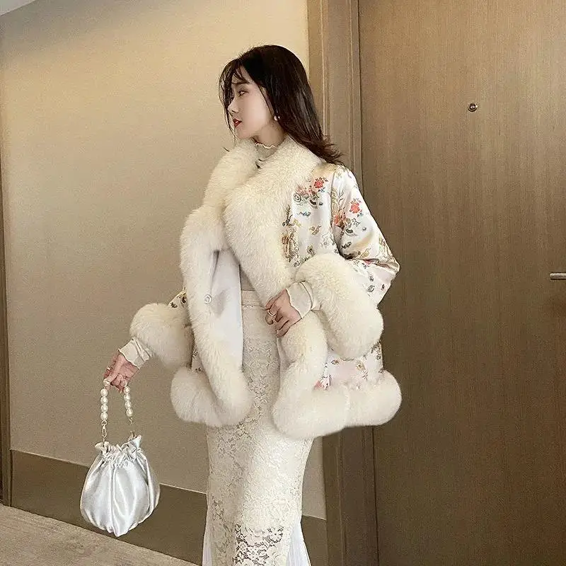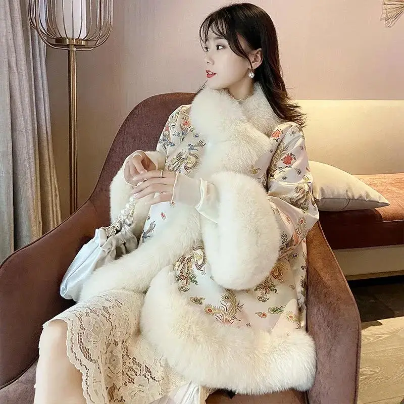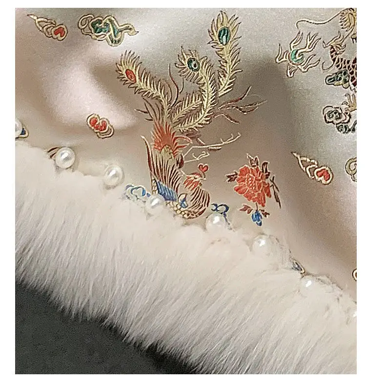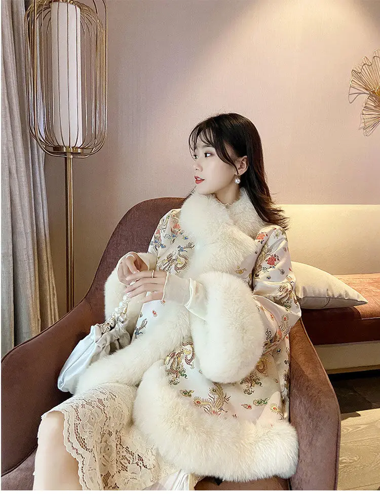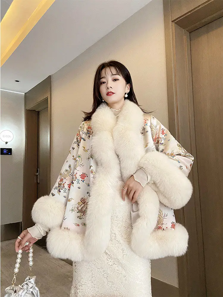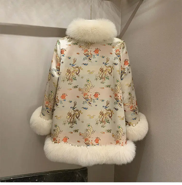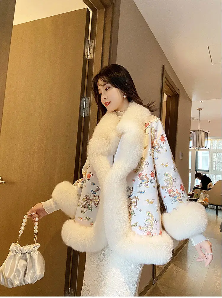 Новинка 2021, зимняя меховая шаль в китайском стиле, плащ с рисунком дракона и феникса, жемчужная пуговица, теплое пальто из искусственного меха