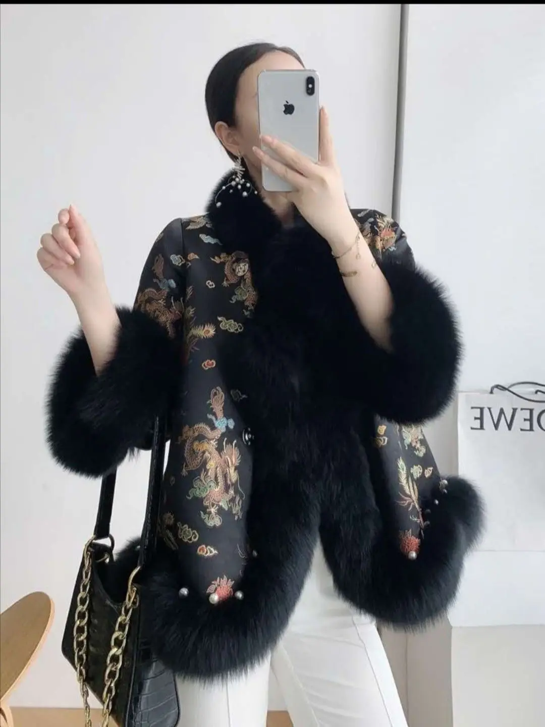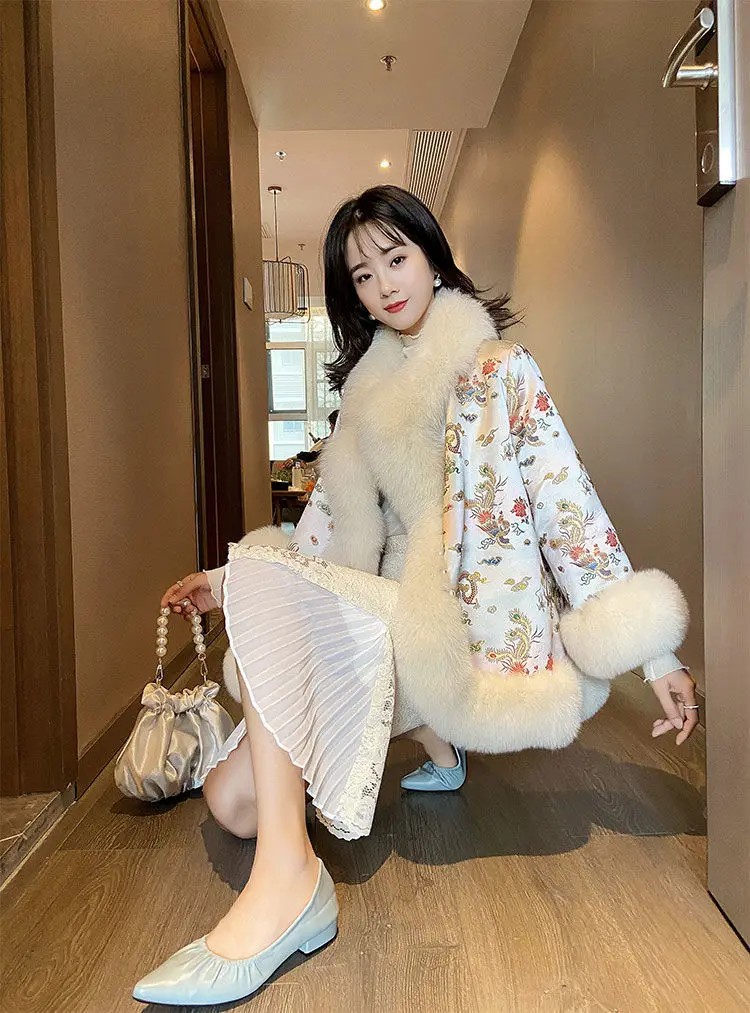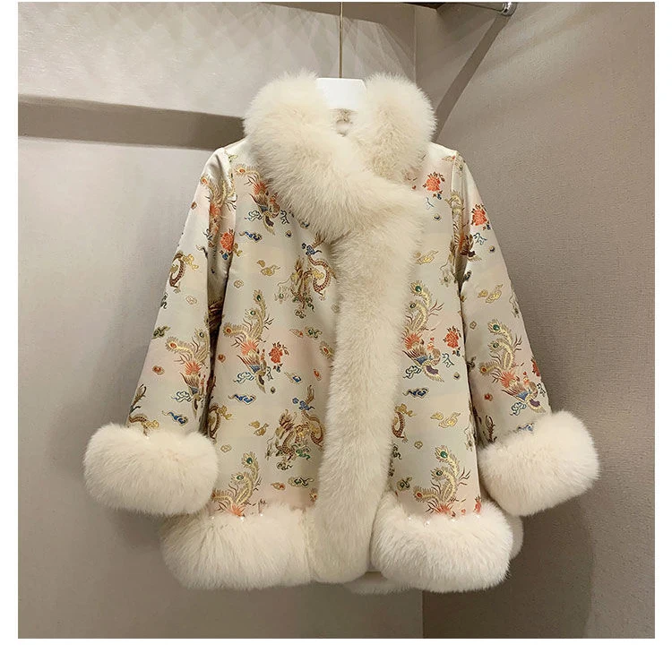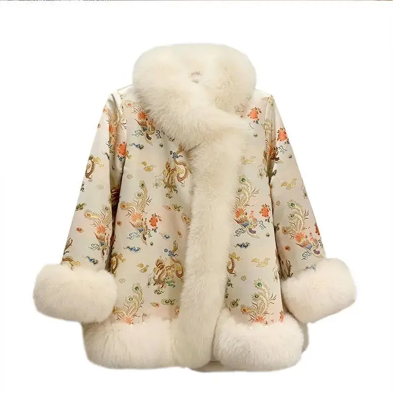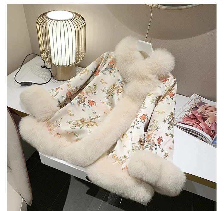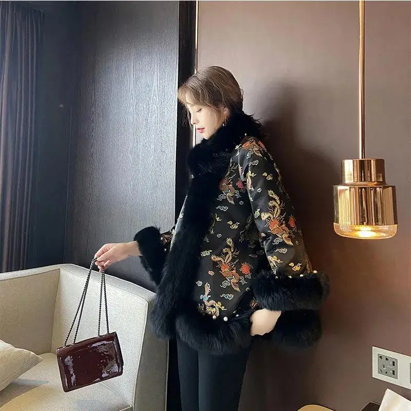 Новинка 2021, зимняя меховая шаль в китайском стиле, плащ с рисунком дракона и феникса, жемчужная пуговица, теплое пальто из искусственного меха
