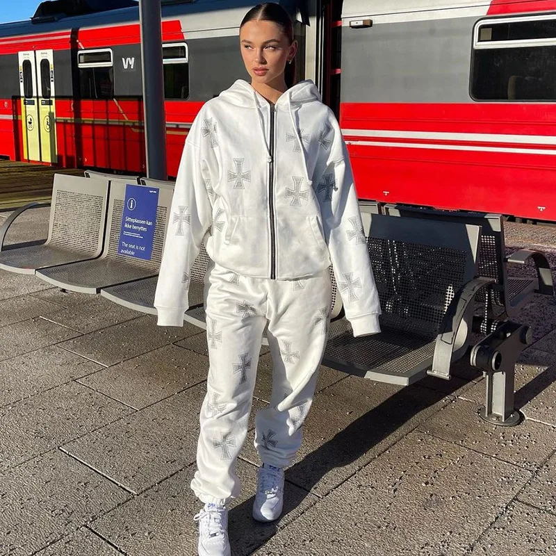 Y2k Harajuku Cross Стразы прямые широкие брюки костюм женские амери...